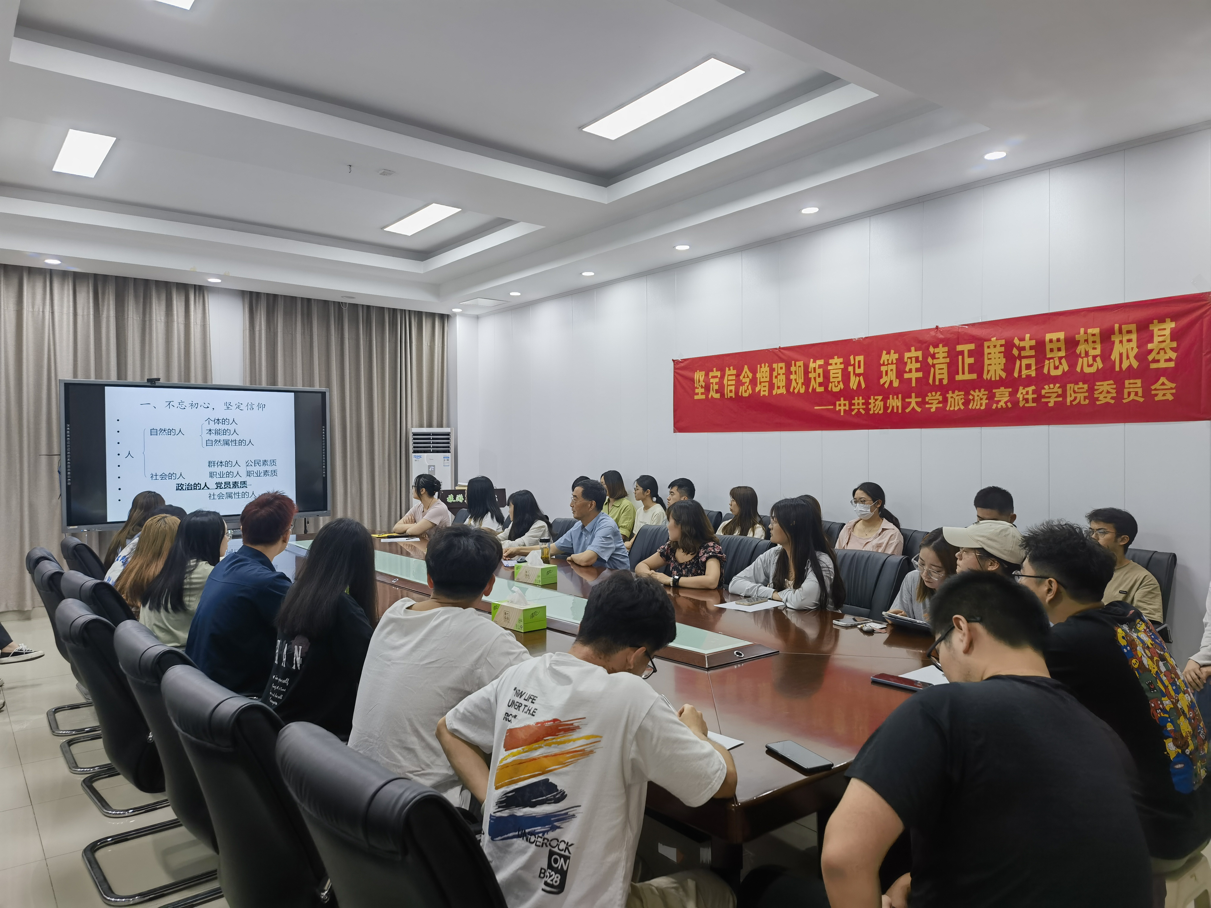 6月16日,旅游烹饪学院党委举办”坚定信念增强规矩意识,筑牢清正廉洁思想根基”毕业生党员廉洁教育主题活动,2023届全体毕业生党员参加活动。