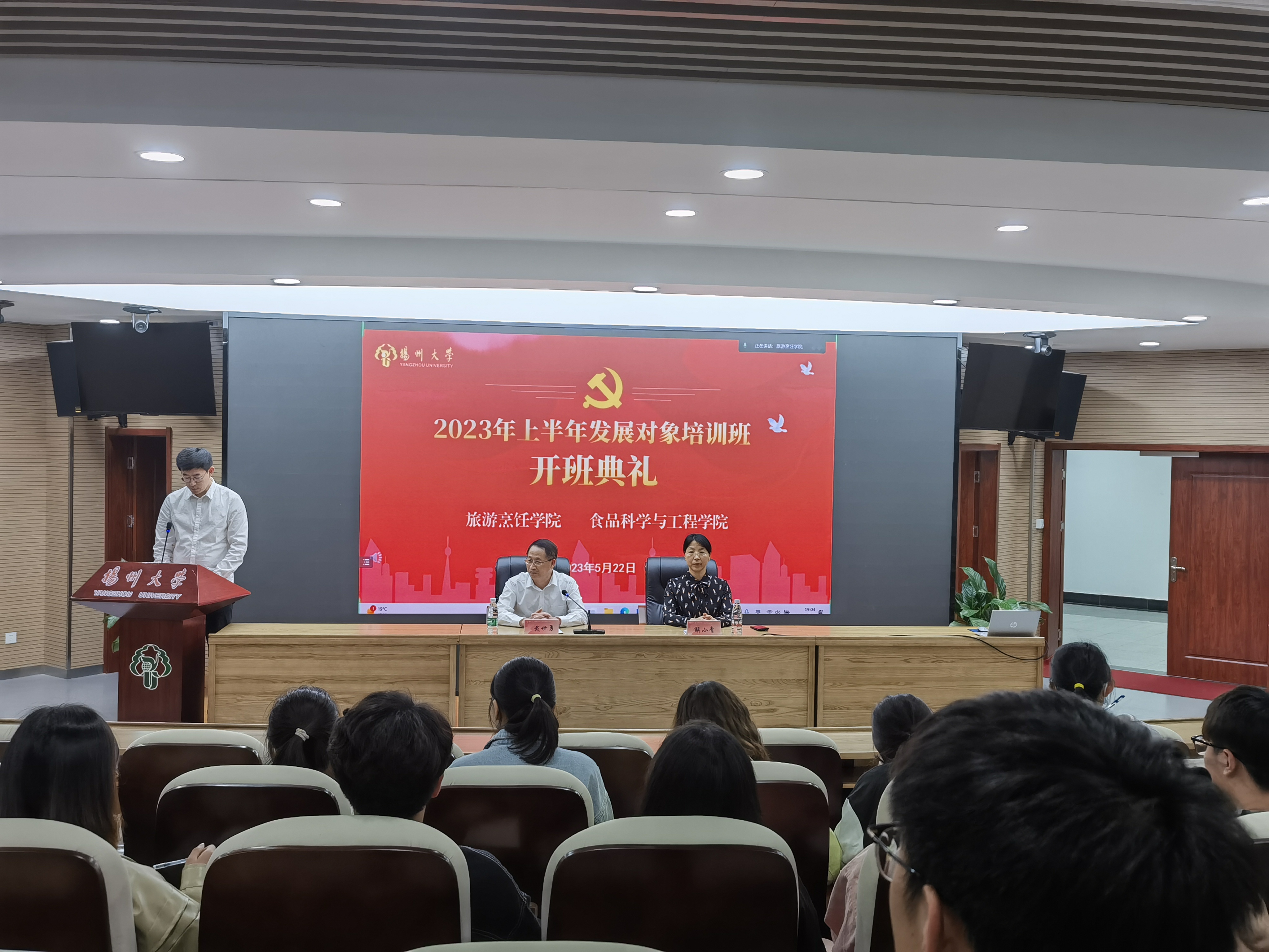 5月22日晚上,旅游烹饪学院和食品科学与工程学院分党校2023年上半年发展对象短期培训班开班典礼在扬子津校区笃行楼N433报告厅举行。我院党委书记解小青、食品科学与工程学院党委书记戴世勇出席开班典礼,王国静老师主持活动。来自两个学院的31名发展对象通过线上线下相结合的方式参加培训。