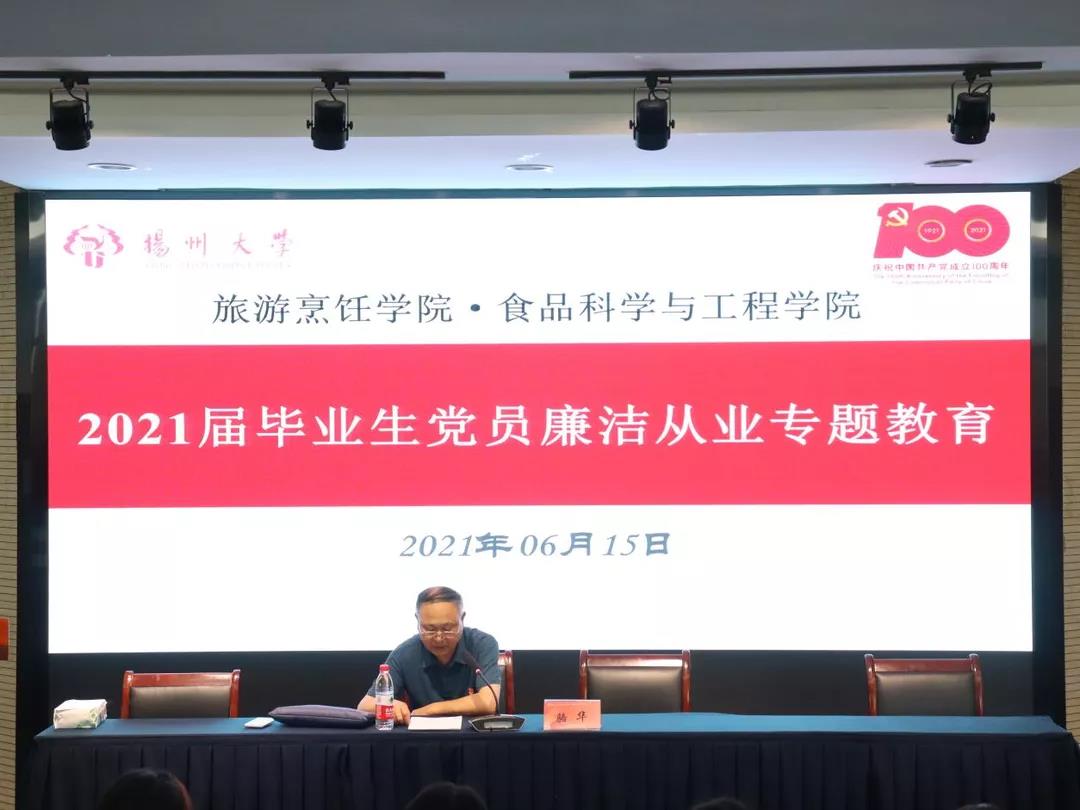 6月15日下午4点,扬州大学旅游烹饪学院·食品科学与工程学院在笃行楼N302顺利开展新党员入党宣誓大会暨2021届毕业生党员廉洁从业专题教育。出席本次会议的有院党委书记孙云寿,院党委副书记解小青,盐阜路校区离退休党总支书记骆华,院党委组织员、纪检员贺新星,院团委书记王敏。本次会议由院党委副书记解小青主持。