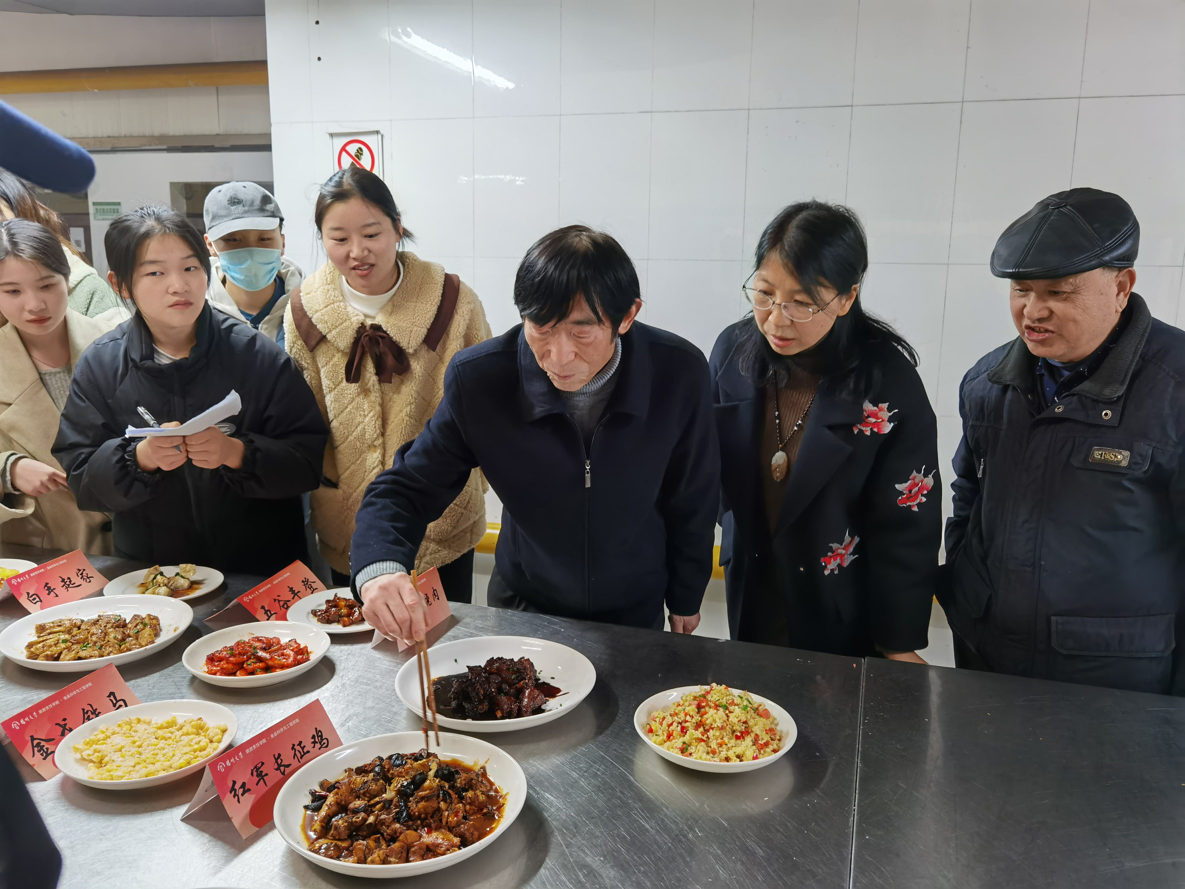 “我们的红军长征鸡是先将老鸡、土豆片、胡萝卜片等煲稔后在鸡身上淋上豆瓣酱、剁椒等再蒸8分钟。”张玉竹同学在向老师们介绍这道红军长征鸡,“红军长征鸡复杂的制作过程象征红军长征途中的走五官,斩六将,虽然过程艰难,但收获时总是十分开心的。”现场不仅能看到烹饪与旅游管理班同学们拿手好菜的制作,也能听到一道道美食背后的红色故事。