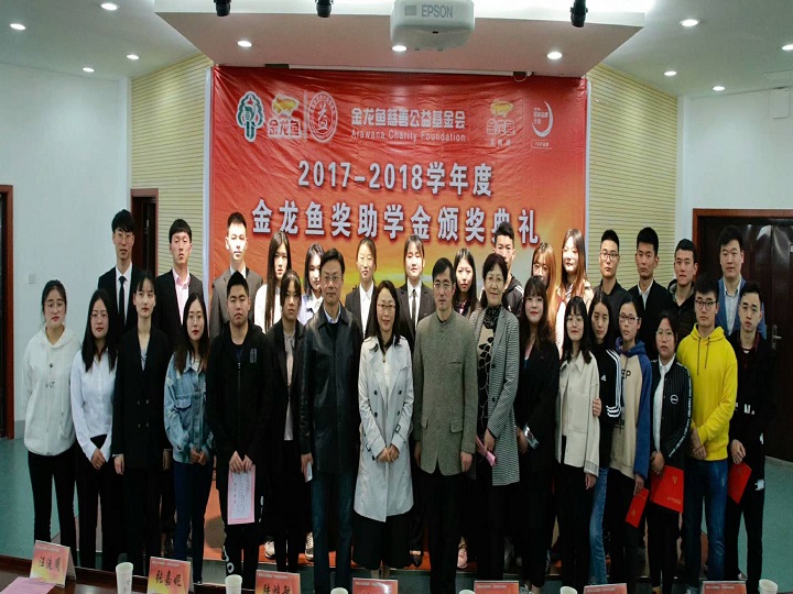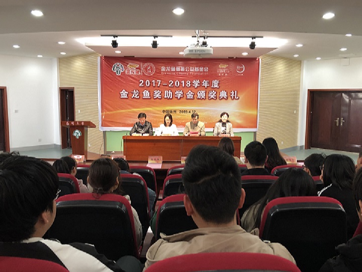4月12日上午,扬州大学旅游烹饪学院·食品科学与工程学院在笃行楼N302教室举行2017-2018学年度金龙鱼奖助学金颁奖典礼。丰益(上海)生物技术研发中心有限公司副总经理、益海嘉里集团研发中心副总监姜元荣女士,院党委书记孙云寿老师,院党委副书记王军老师,副院长韩春鲜老师出席奖助学金颁发仪式,颁奖典礼由院党委副书记王军老师主持。