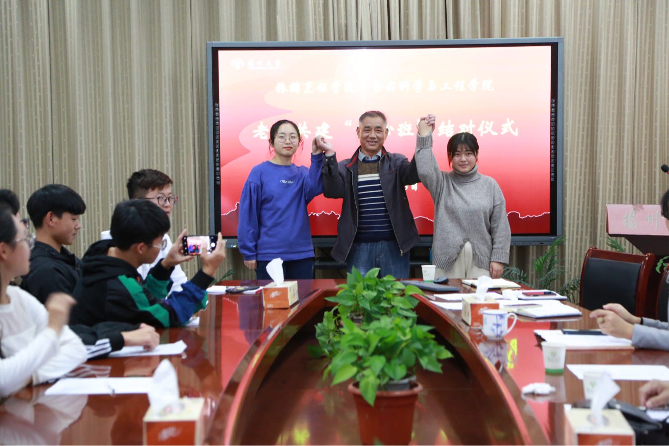 11月5日下午3点,我院在笃行楼院会议室举行老少共建“匠心班”结对仪式。院党委副书记解小青、院团委书记王敏、院团委副书记徐华林、辅导员孙雪凡,盐阜路离退休党总支骆华等四位离退休老同志,营养1902班和烹饪1903班的同学们出席了本次会议,会议由解小青书记主持并讲话。