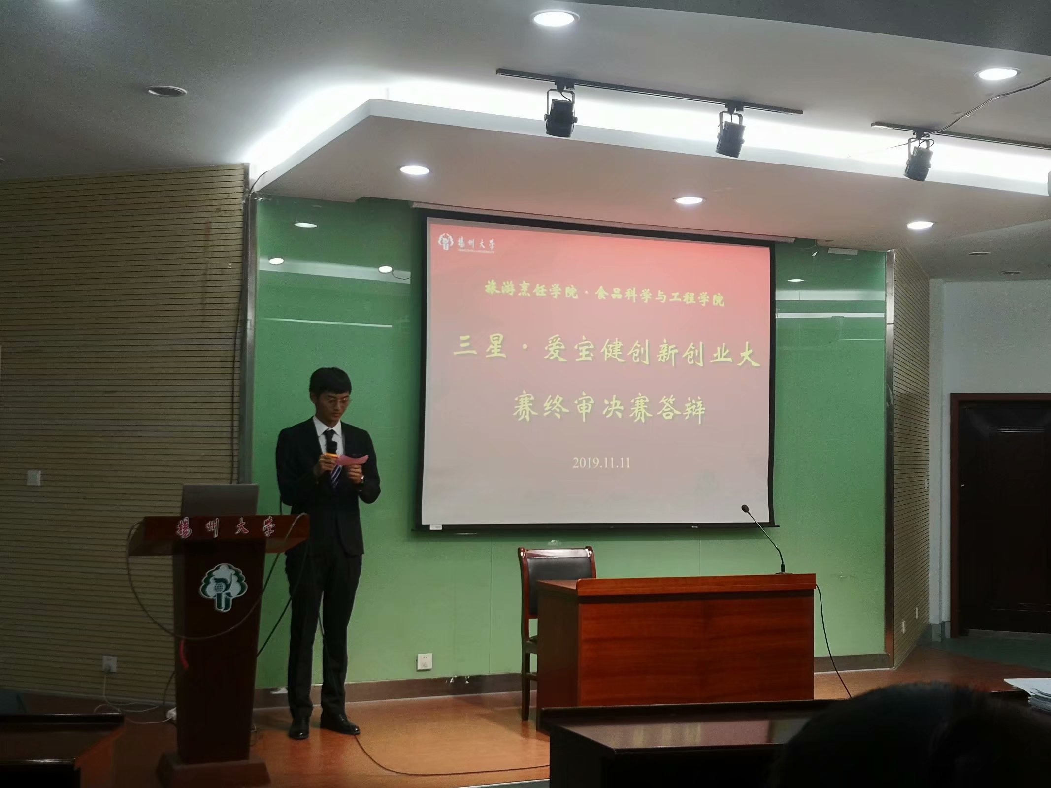11月11日晚6点30分,旅游烹饪学院·食品科学与工程学院在笃行楼N302召开了“三星·爱宝健”创新创业大赛终审决赛答辩会。校就业指导中心副主任孙鹏程、院团委书记王敏、院团委老师孙雪凡担任本次大赛评委。