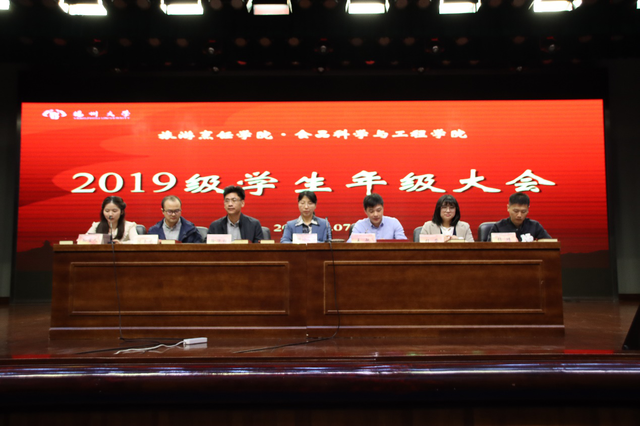10月7日下午,旅游烹饪学院·食品科学与工程学院在扬子津文体馆报告厅召开2019级学生年级大会。院党委副书记解小青、院团委书记王敏、院团委副书记徐华林、辅导员程莹、陈玉龙、杨靖出席会议。会议由辅导员孙雪凡老师主持,2019级全体同学参与会议。
