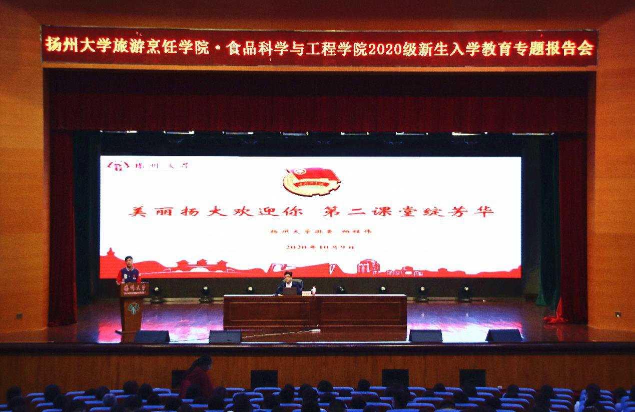 10月18日下午六点,旅游烹饪学院·食品科学与工程学院在文体馆三楼剧场召开了2020级新生第二课堂成绩单实施意见政策解读会。校团委柏程伟老师、院团委书记王敏、辅导员杨靖出席本次会议。2020级全体新生到场。会议由王敏书记主持。