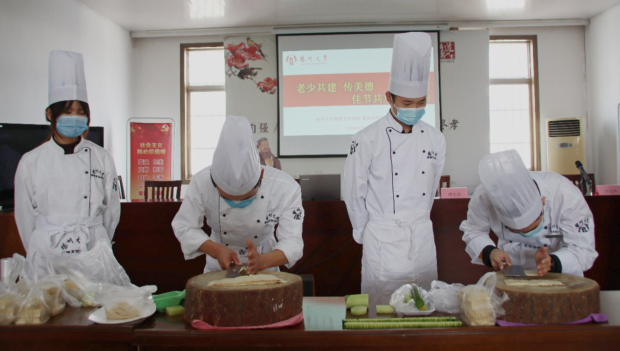 洽谈会上,我院领导与社区领导共同协调工作,建立长效稳定工作联系;共同做好党员思想政治教育培训,制定学习计划,走访参观;共同完善党团支部建设工作,完善各项党建制度,并顺利完成结对共建签约仪式。随后,解小青书记简要介绍了学院概况并邀请老领导参观。她表示,扬州大学旅烹专业是全国一流专业,有着30年历史,是烹饪界的黄埔军校。接着,胡靖同学进行饮食营养知识宣讲。胡靖同学讲道:“营养对于老人极为重要。食物宜杂,质量宜高,数量宜少,速度宜缓,蔬菜宜多,口味宜淡。”宣讲过后,我院烹饪专业学生进行技能展示——蓑衣黄瓜、劈干丝。展示成品发放给社区老人。此外,学院还给每位党员都准备了学生们切的干丝。最后,党员代表陆开存进行即兴发言。他从国家层面讲述了道德与法治的关系以及自己对于道德的理解:道德是原则、规范,人民都遵循道德,就能得道,达成共赢。
