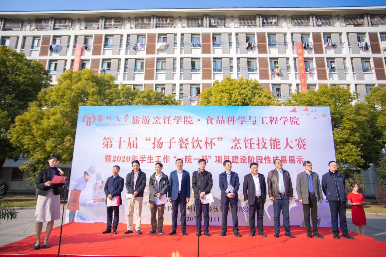 11月11日下午,旅游烹饪学院·食品科学与工程学院在扬子津东校区南广场成功举办第十届“扬子餐饮杯”烹饪技能大赛暨2020年学生工作“一院一品”项目阶段性成果展示。校党委副书记叶柏森、校党委常委、宣传部部长张信华、校学生工作部部长林刚、校研究生工作部部长吴刚、校保卫部部长姚永明、校团委副书记刘斯文、常州扬子津餐饮管理有限公司副总经理孙炳群、院党委书记孙云寿、院长周晓燕、院党委副书记解小青、副院长孟祥忍出席了本次活动,活动由院党委副书记解小青主持。