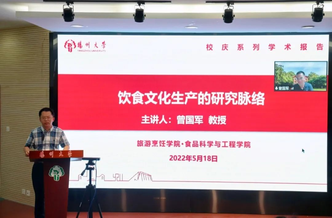 5月18日下午四点,中山大学旅游学院曾国军教授应邀为扬州大学旅游烹饪学院·食品科学与工程学院师生带来了一场题为《饮食文化生产的研究脉络》的学术报告。本次讲座为扬州大学120周年校庆系列学术活动,由中山大学旅游学院曾国军教授主讲,我院副院长侯兵主持,全体辅导员老师、部分专业课老师及学生采用线上+线下相结合的方式听取了讲座。
