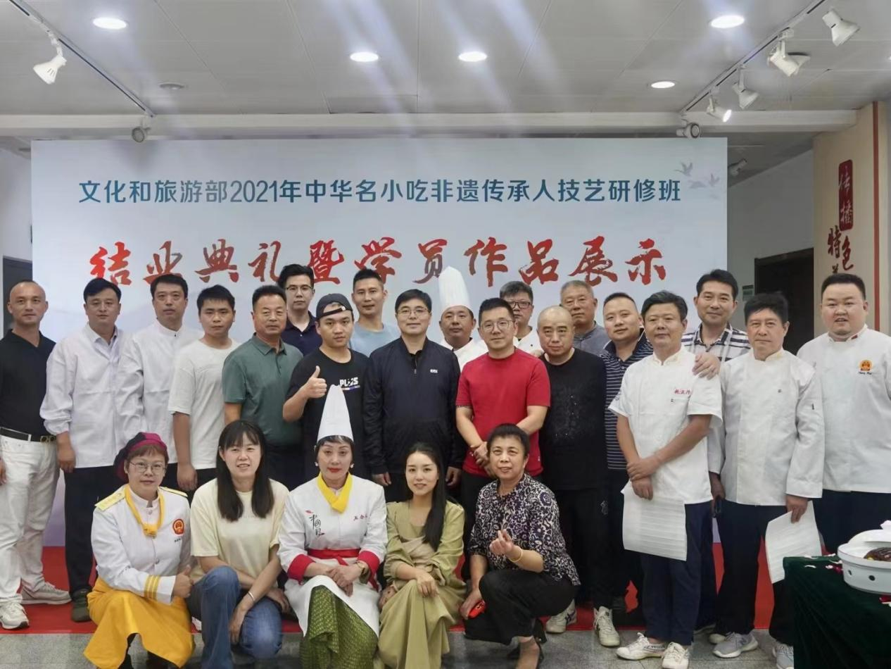 28日下午,文化和旅游部2021年中华名小吃非遗传承人技艺研修班结业典礼在扬州大学扬子津校区中餐非遗技艺传承文化和旅游部重点实验室举行。本次活动是旅游烹饪学院第八次承办非遗传承人群研修班,多年来,扬州大学旅游烹饪学院一直将非遗传承作为己任,依托自身学科专业特色,推动名小吃非遗技艺的传承保护、科学发展,切实做好非遗美食的传承与发扬,现场30余名非遗传承人毕业学员,为大家呈现了一场精美绝伦的非遗美食盛宴。