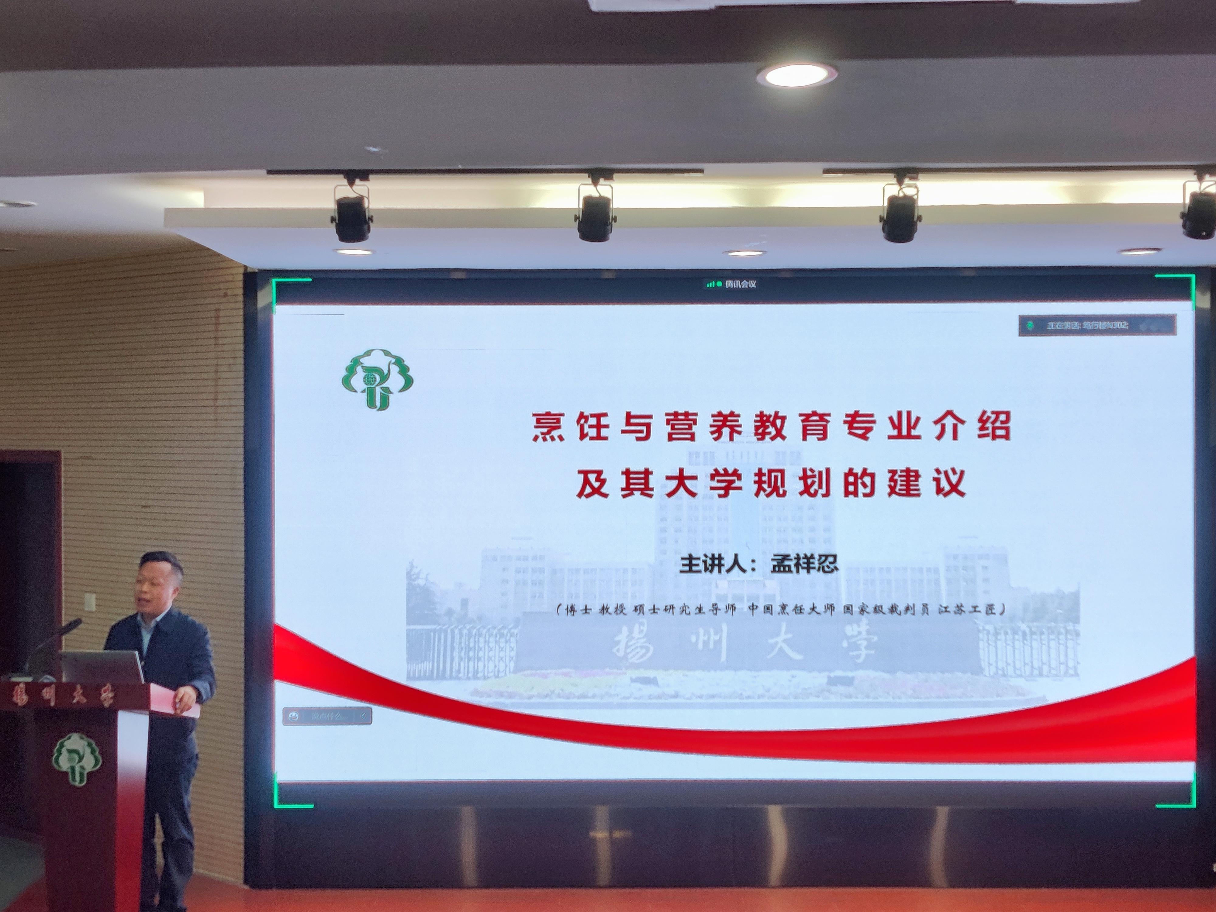 11月7日晚7点,扬州大学旅游烹饪学院·食品科学与工程学院在笃行楼N302教室召开了烹饪与营养教育专业职业生涯规划专题讲座,参与本次讲座的有副院长孟祥忍老师,院团委副书记徐华林老师,22级辅导员杨浩南老师。本次讲座采用线上线下相结合的方式,由孟祥忍老师主讲,徐华林老师主持。