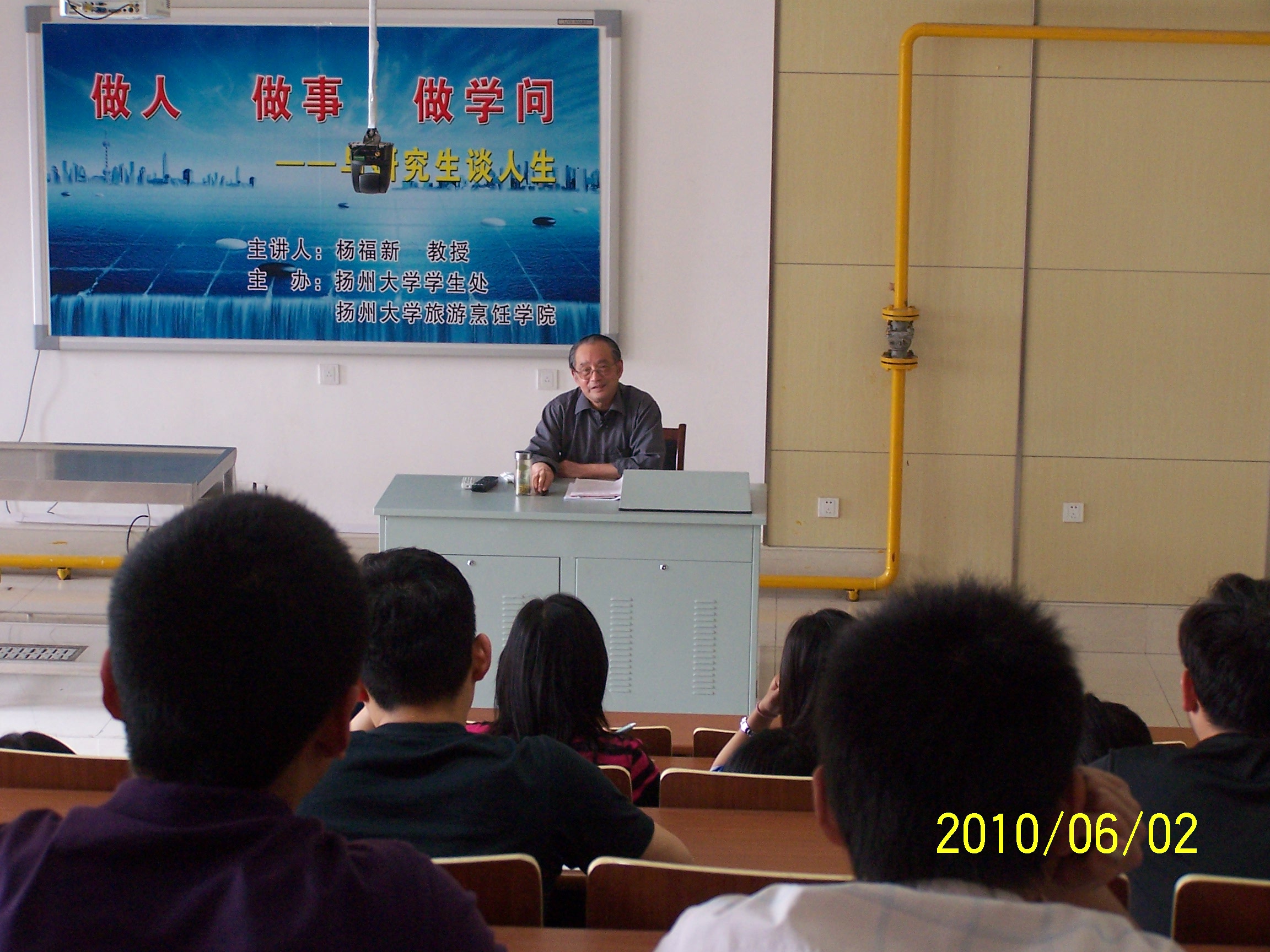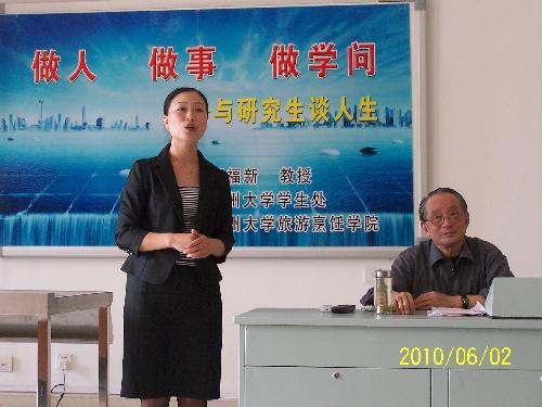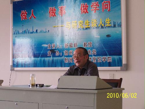 2010年6月2日下午,扬州大学关心下一代工作委员会副主任杨福新教授,为旅游烹饪(食品科学与工程)学院、机械工程学院、能源与动力学院、环境科学与工程学院四个学院的研究生做了一场主题为“做人、做事、做学问---与研究生谈人生”的思想报告。