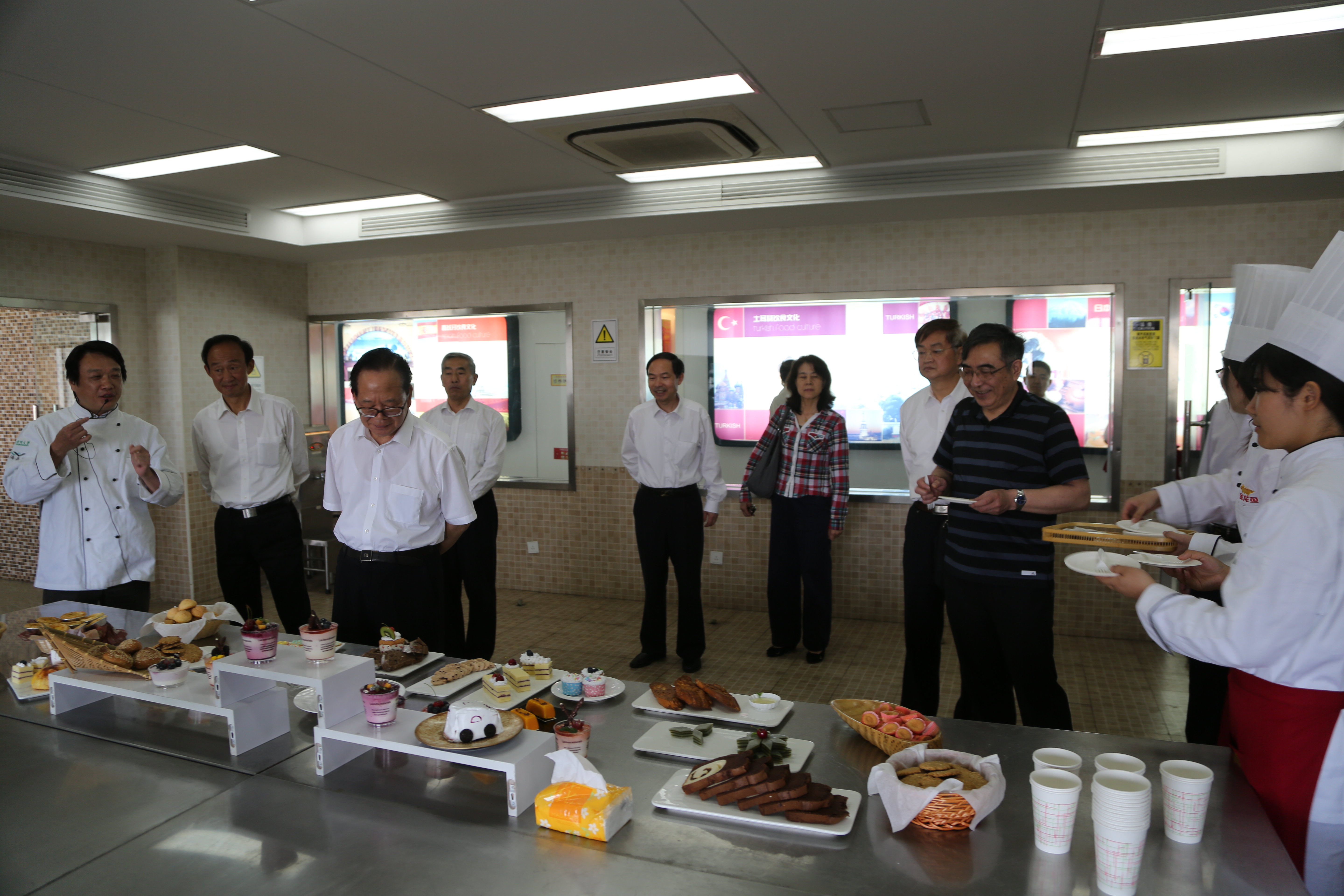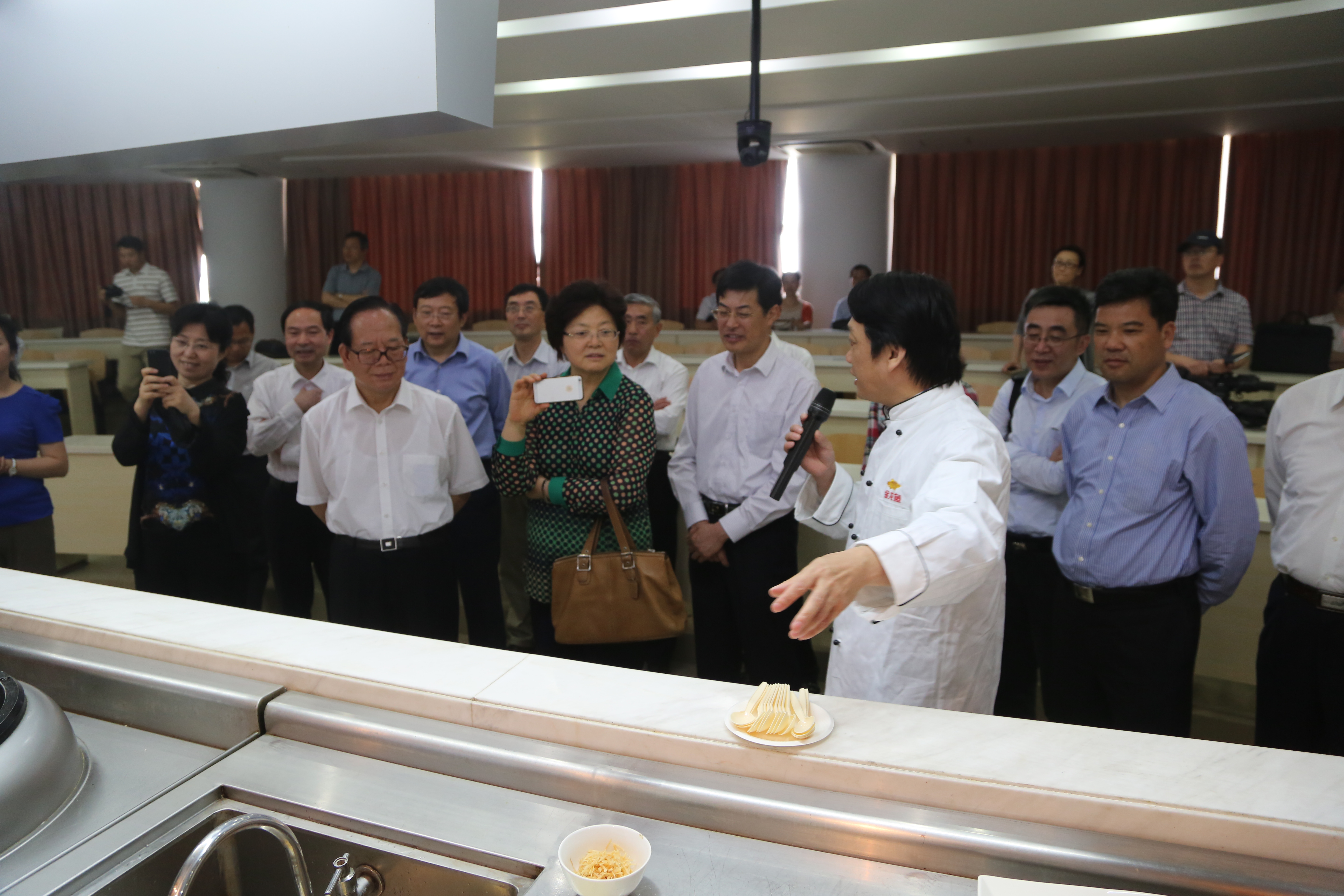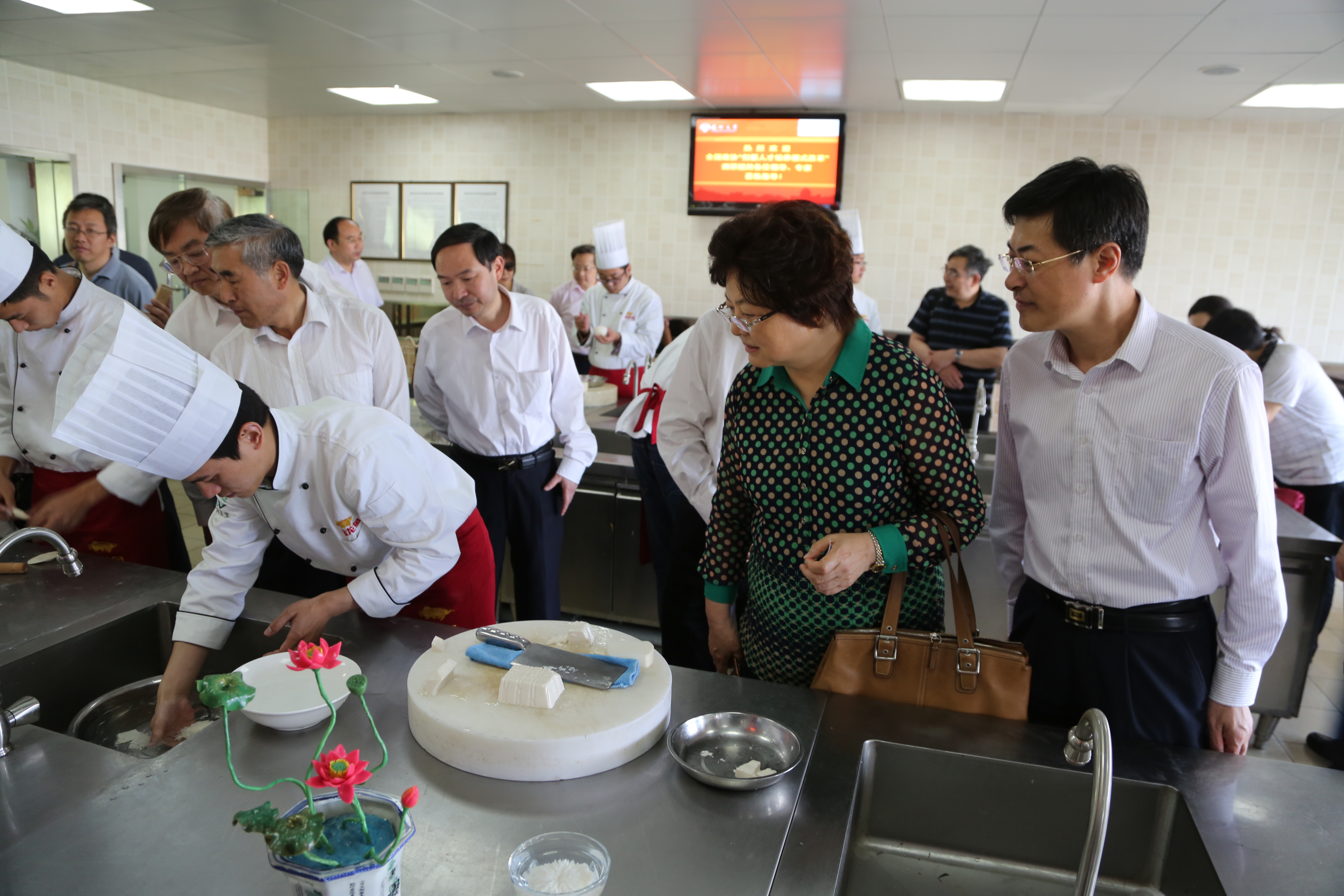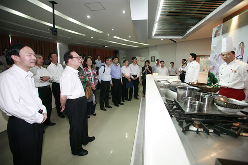 5月24日下午,全国政协常委、教科文卫体委员会主任张玉台一行30余人来到我院,就“创新人才培养模式改革”进行考察调研。调研组考察了学院金龙鱼国际烹饪研究院和世界饮食文化长廊、现场观摩了学生食品雕刻、文丝豆腐等的制作过程,听取学院创新人才培养介绍。江苏省政协、江苏省教育厅、扬州市政协有关部门负责同志,校领导焦新安、刘延庆、叶柏森、刘祖汉、胡效亚等陪同调研。校党办、校办、教务处、研究生院(研工部)、学科办、科技处、人文社科处等负责同志以及学院蔡丽娅、王新驰、周晓燕等参加活动。