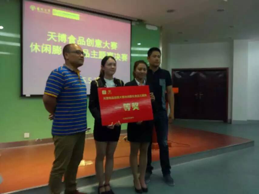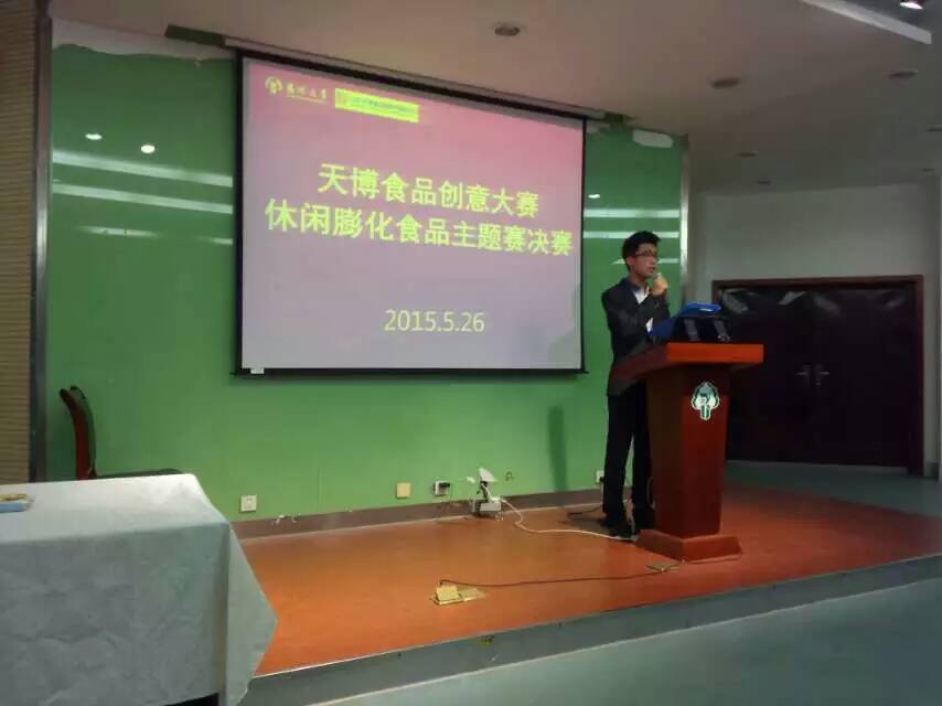 2015年5月26日晚,天博食品创意大赛膨化食品主题赛决赛(扬州大学站)在我院圆满结束。共有16个团队进入决赛环节。各团队负责人以PPT或宣传片的方式介绍作品创意理念和自己团队的宣传情况,评委在听取各团队汇报的同时对作品进行品尝,结合评审项目及分值对作品进行打分。在答辩环节中,评委和专家们分别对各个团队的作品进行了点评与指导,决赛呈现了许多优秀的作品与创意。通过激烈的角逐,double lee团队的作品“酥酥”凭借独特的创意获得评委的一致好评,摘得桂冠;“苔滋味”“花见”两个团队取得了第二名;“花痴”“忆江南”“小西饼”获得第三名的好成绩。“艾格饼”“多趣仙贝”“肉嬷嬷”三个团队荣获本次比赛优秀奖,“艾米果”等三个团队摘得最佳宣传奖。