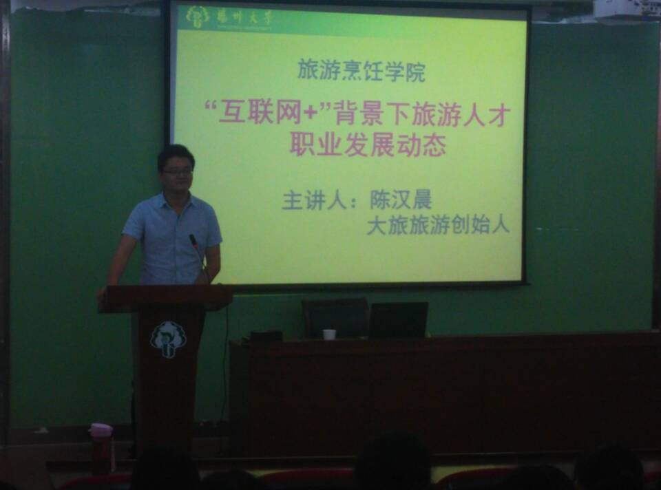 6月5日上午,我院2010届毕业生陈汉晨(现为扬州大旅旅游总经理)应邀回母院给旅游管理专业的学生作《“互联网+”背景下旅游人才职业发展的新动态》的专题讲座。