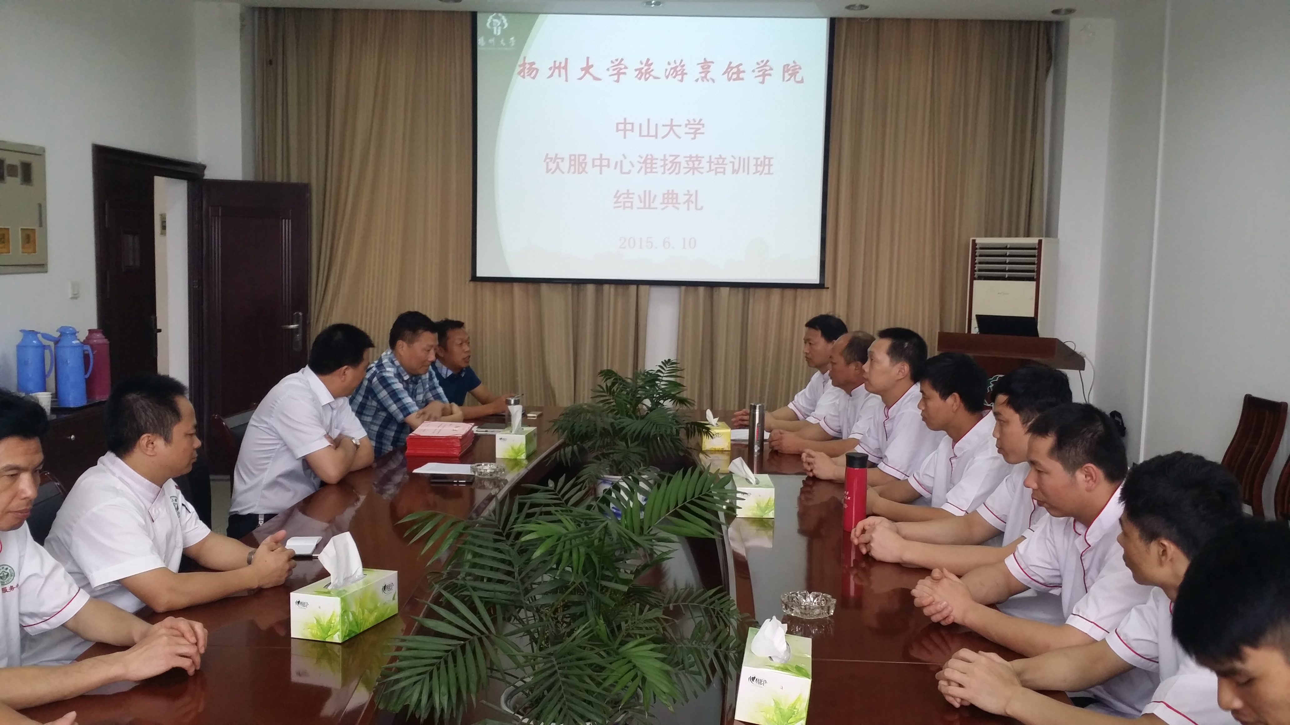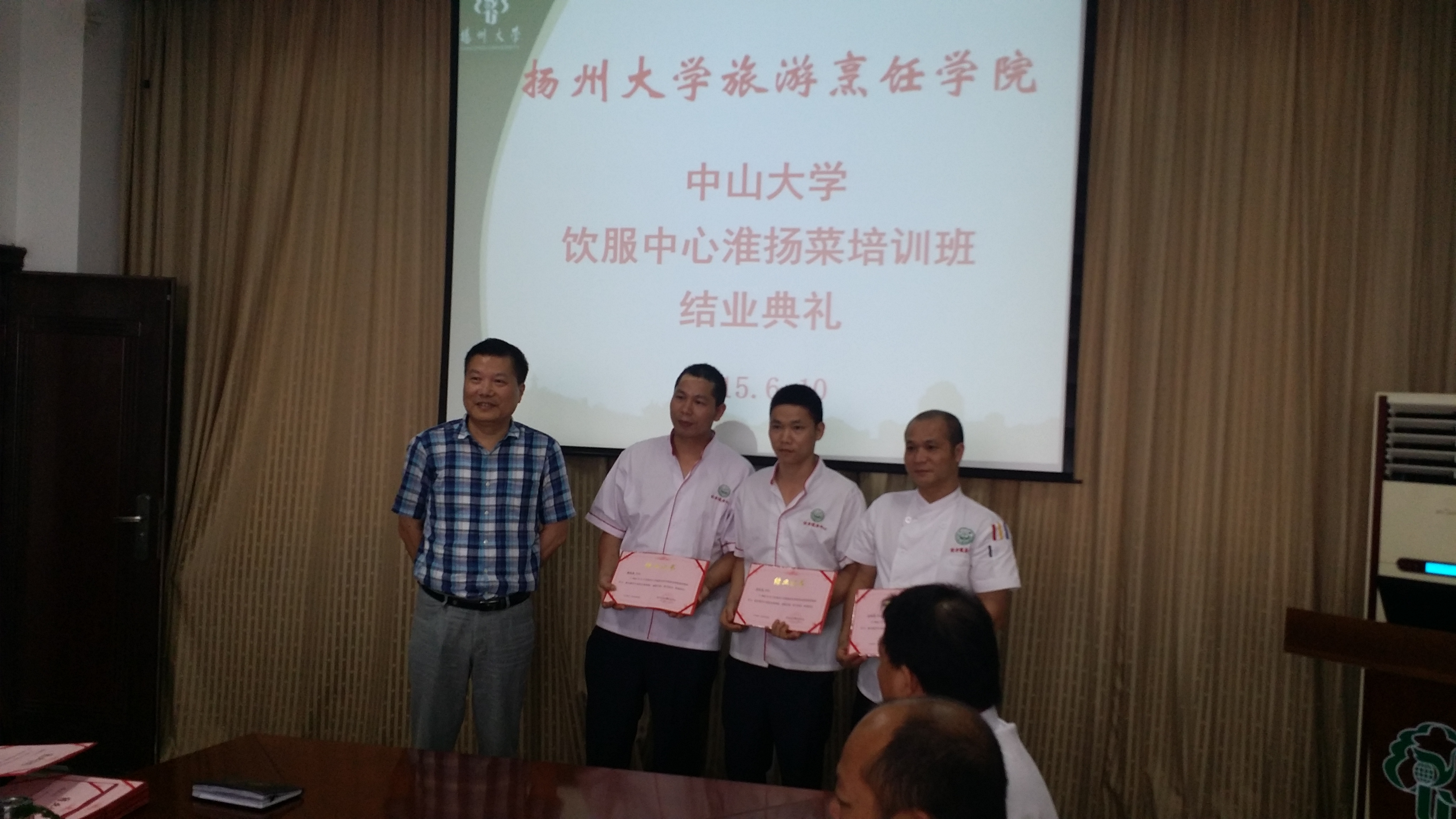 由中山大学饮服中心委托我院烹饪专业举办的淮扬菜培训班经过10天的紧张培训,6月10日下午在笃行楼三楼会议室举行结业典礼。