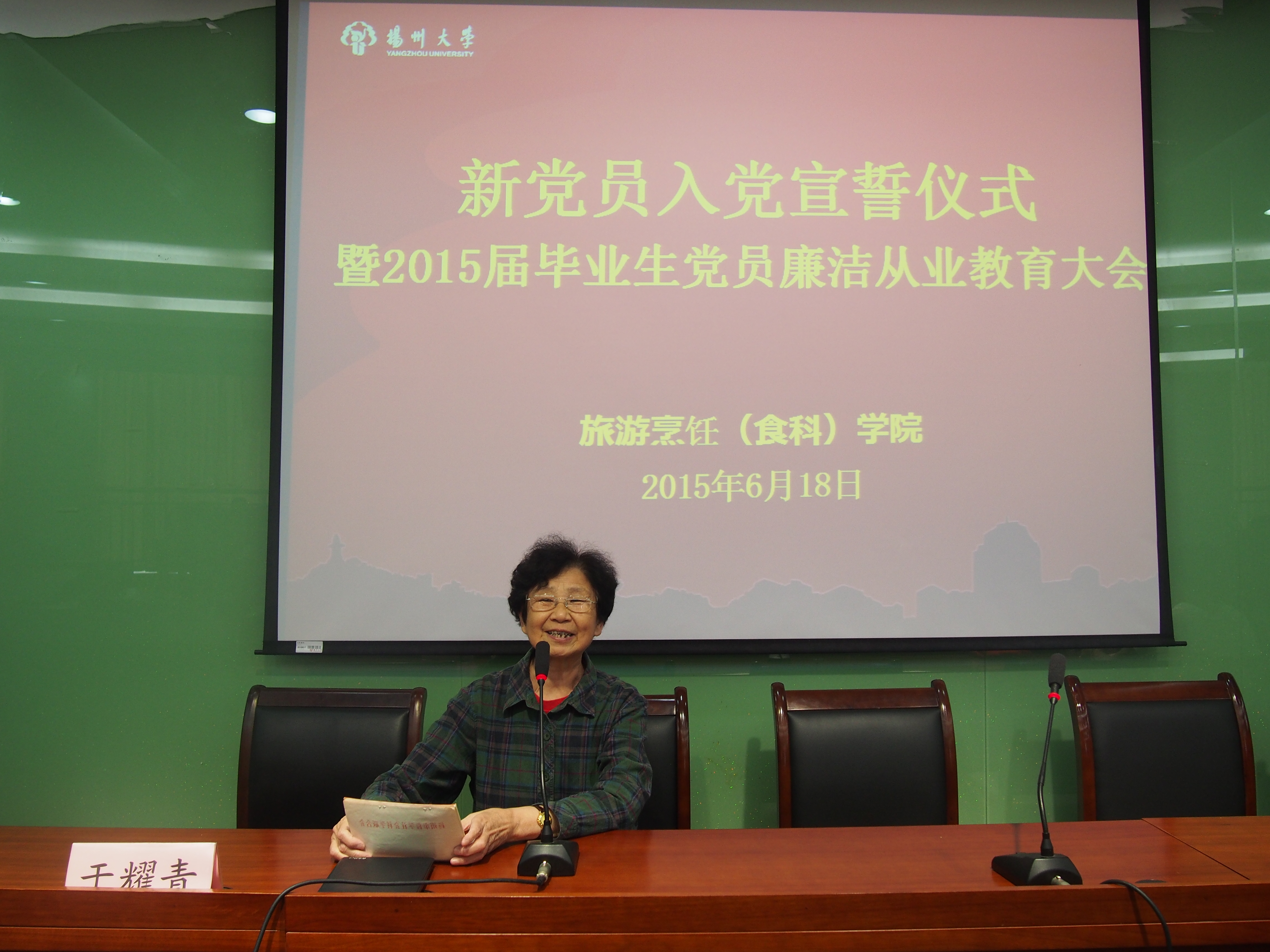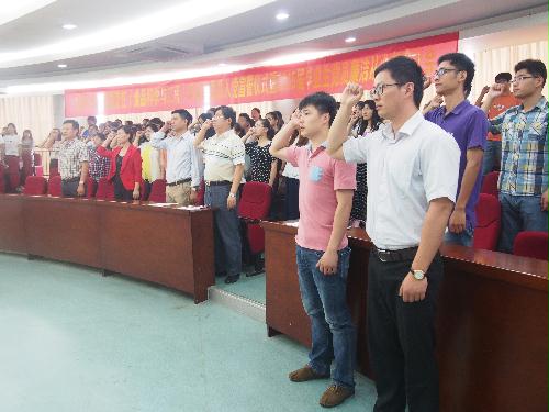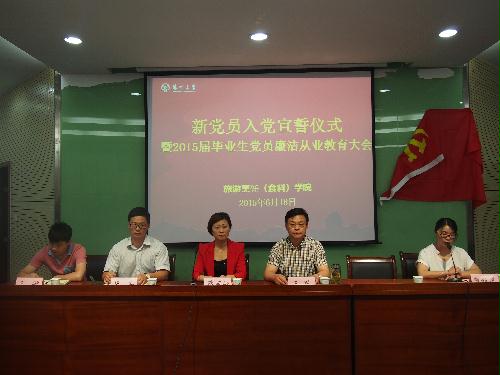 6月18日上午,学院在笃行楼N302举行新党员入党宣誓仪式暨2015届毕业生党员廉洁从业教育大会。宣誓仪式由学生支部书记贺新星老师主持,辅导员刘欢老师带领全体党员在鲜红的党旗下进行宣誓,蒋海蓉同学代表全体新党员发言,她表示,自己能成为一名党员倍感自豪,也深感责任重大;入党积极分子代表朱豆豆同学表达了参加此次入党宣誓的激动心情,表示要认真学习党章,积极向党组织靠拢。党委书记蔡丽娅书记向新党员提出要求,希望他们能时刻牢记全心全意为人民服务的根本宗旨,牢记入党誓言,充分发挥党员的先锋模范带头作用,真正成为一名优秀的共产党员。宣誓仪式结束后,盐阜路校区离退休党总支书记于耀青为毕业生党员作题为“人在旅途——人生中的三个关键词”廉洁从业报告,希望新党员们在走上工作岗位后要继续保持学习的心态和勤奋的品德,与困境和挫折作斗争,正确对待名和利,坚持廉洁和清明的工作作风,为社会主义事业做出应有的贡献。党委副书记王军、组织员赵攀、学生党支部书记,团委、学工办老师和入党积极分子代表参加了本次活动。