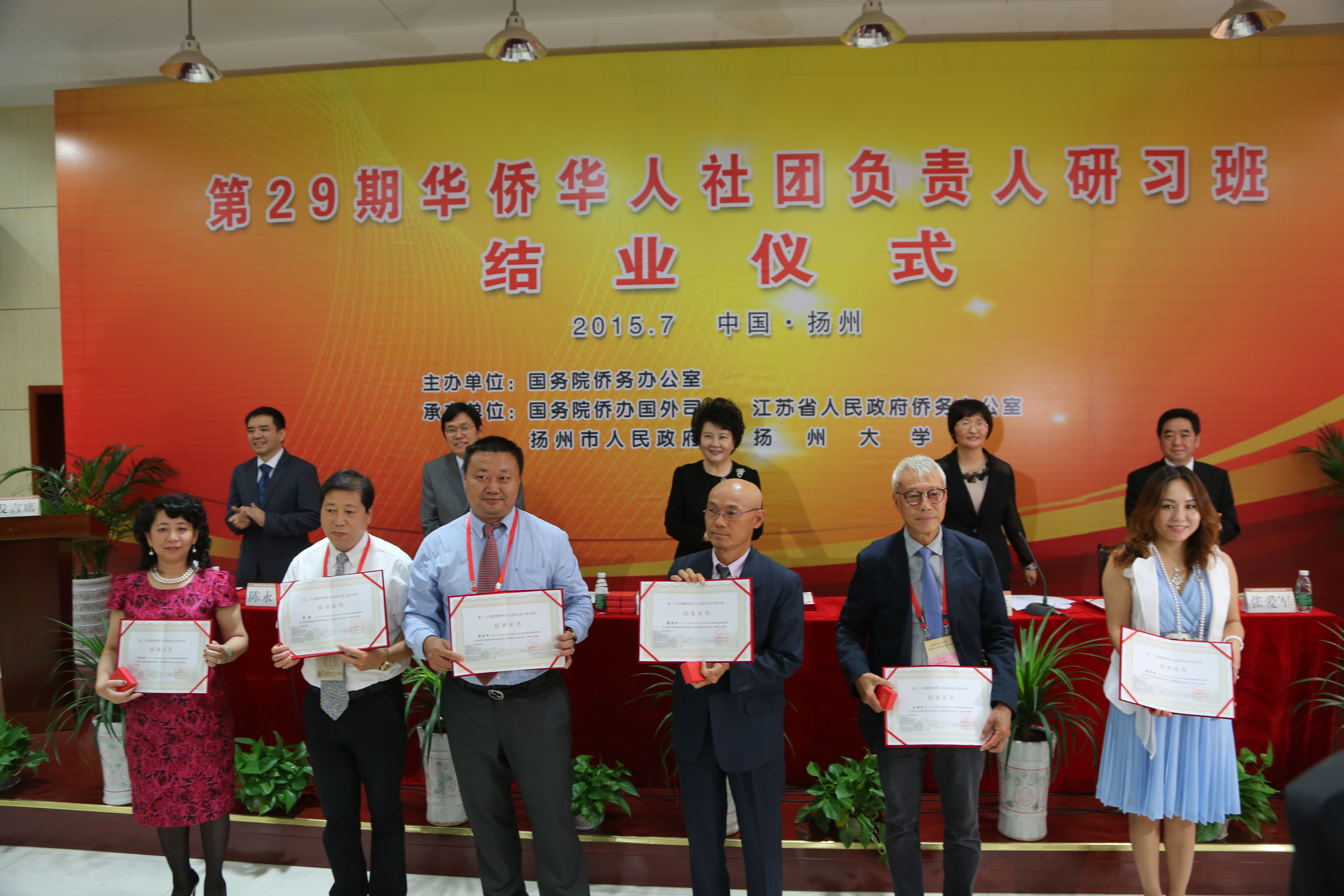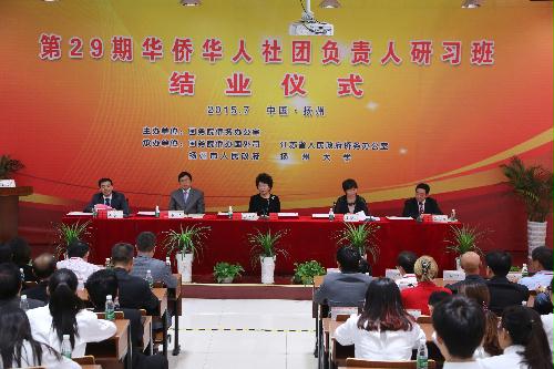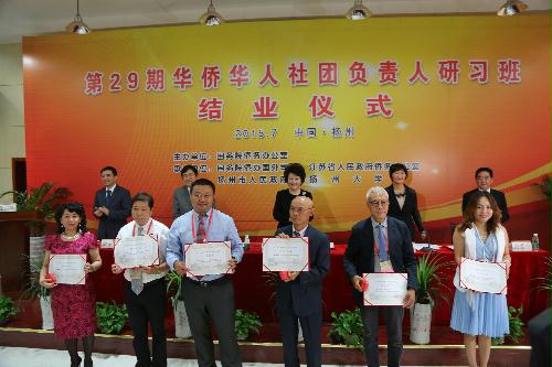 7月14日上午,第29期海外华侨华人社团负责人研习班结业仪式在我院举行。国务院侨务办公室主任裘援平、国务院侨办国外司司长王晓萍、江苏省侨办主任王华、扬州市委副书记张爱军、副校长陈永平等分别在结业典礼上讲话,并为42位海外侨领颁发结业证书。