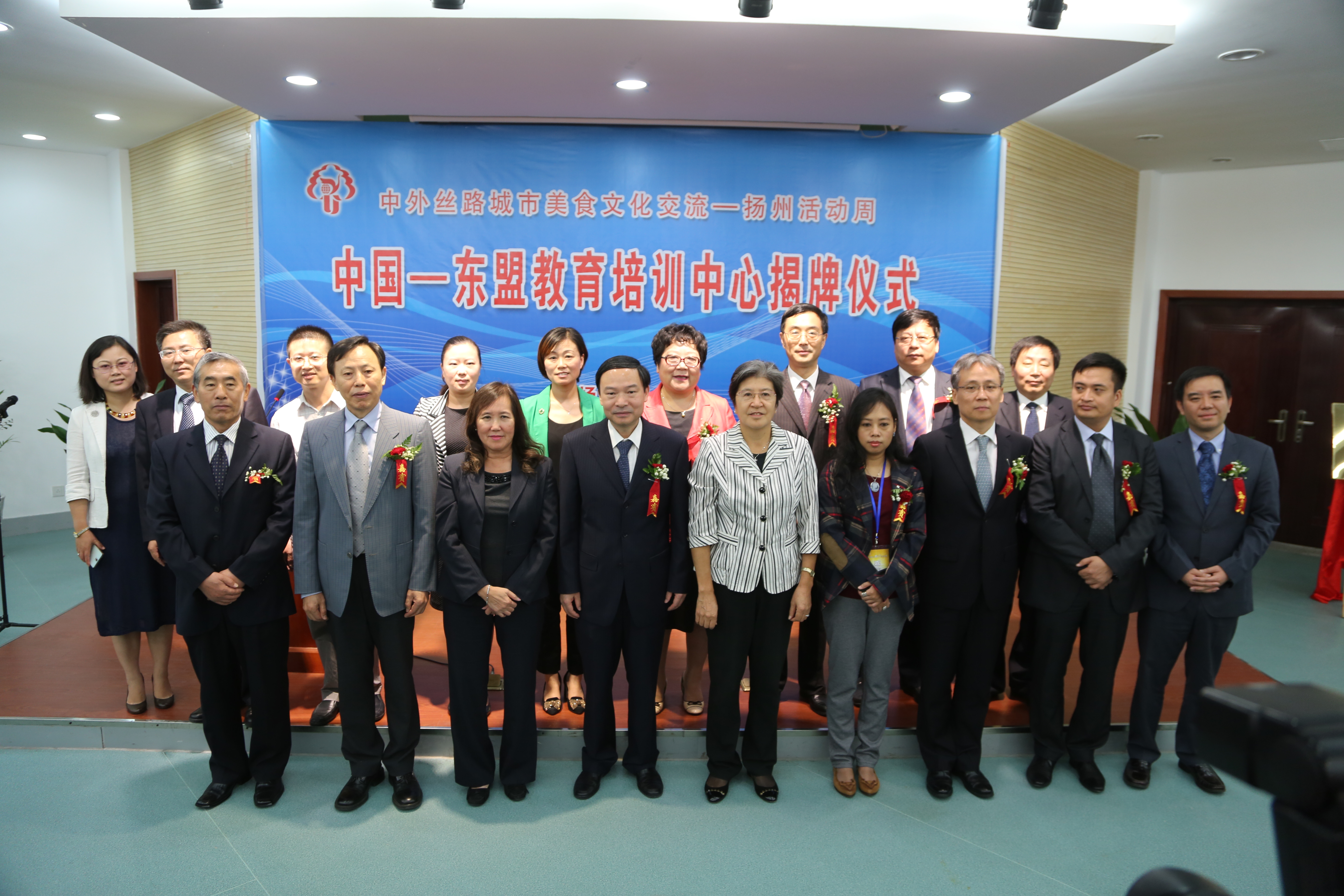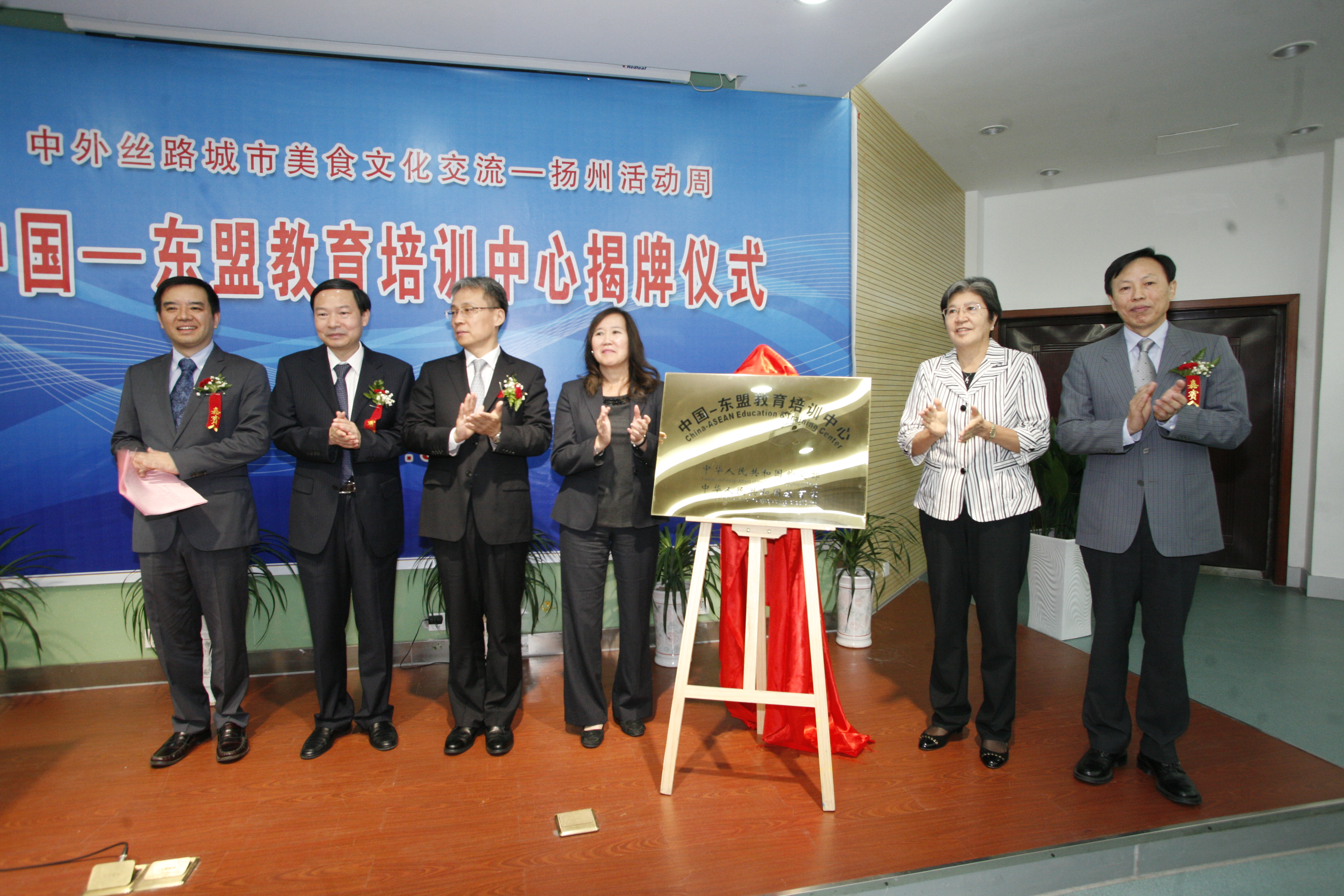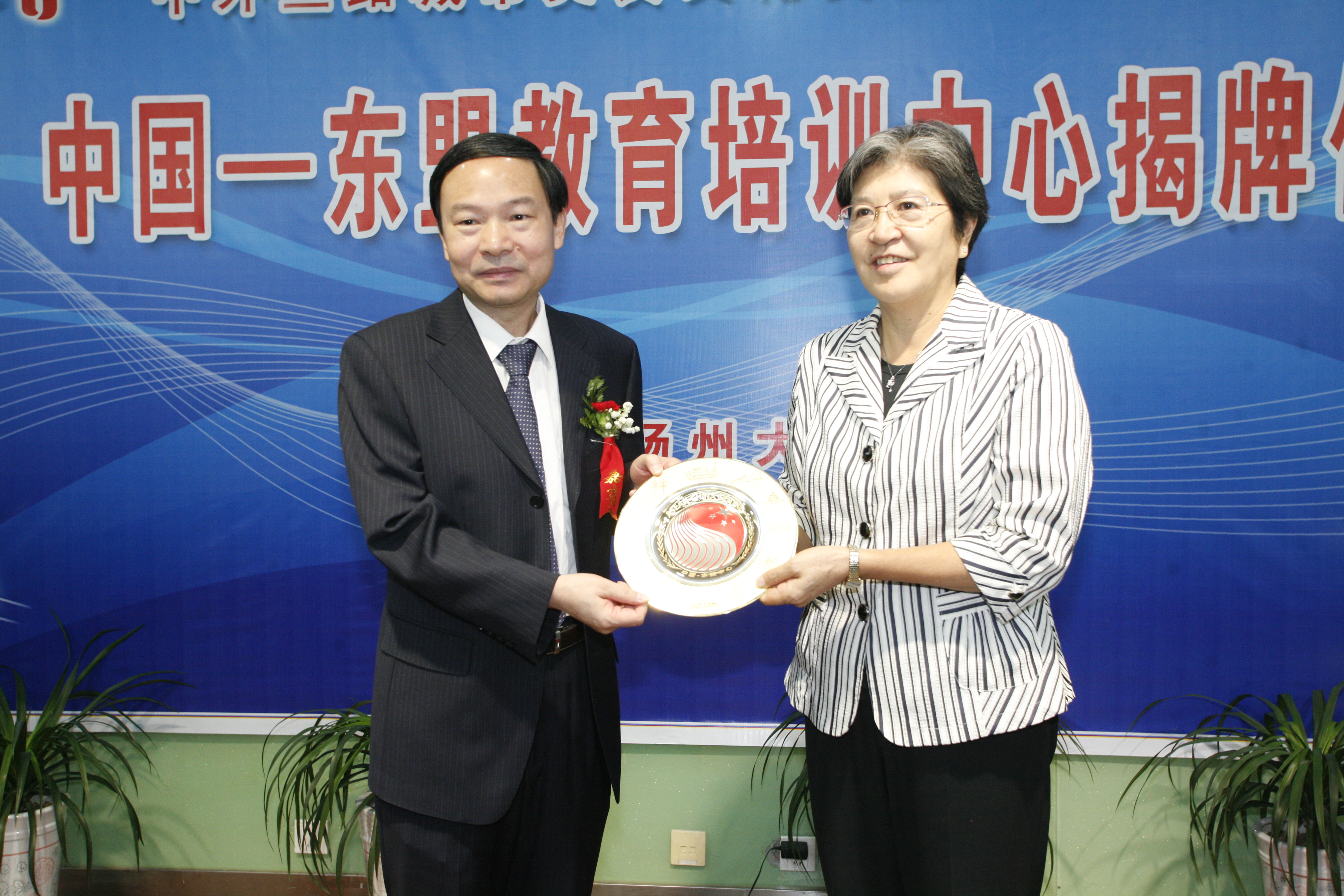 He Magdalene Teo、杨秀萍、刘宝利、焦新安和扬州市人民政府副市长汪志坚共同为“中国-东盟教育培训中心”揭牌,杨秀萍和焦新安还互赠了礼品。