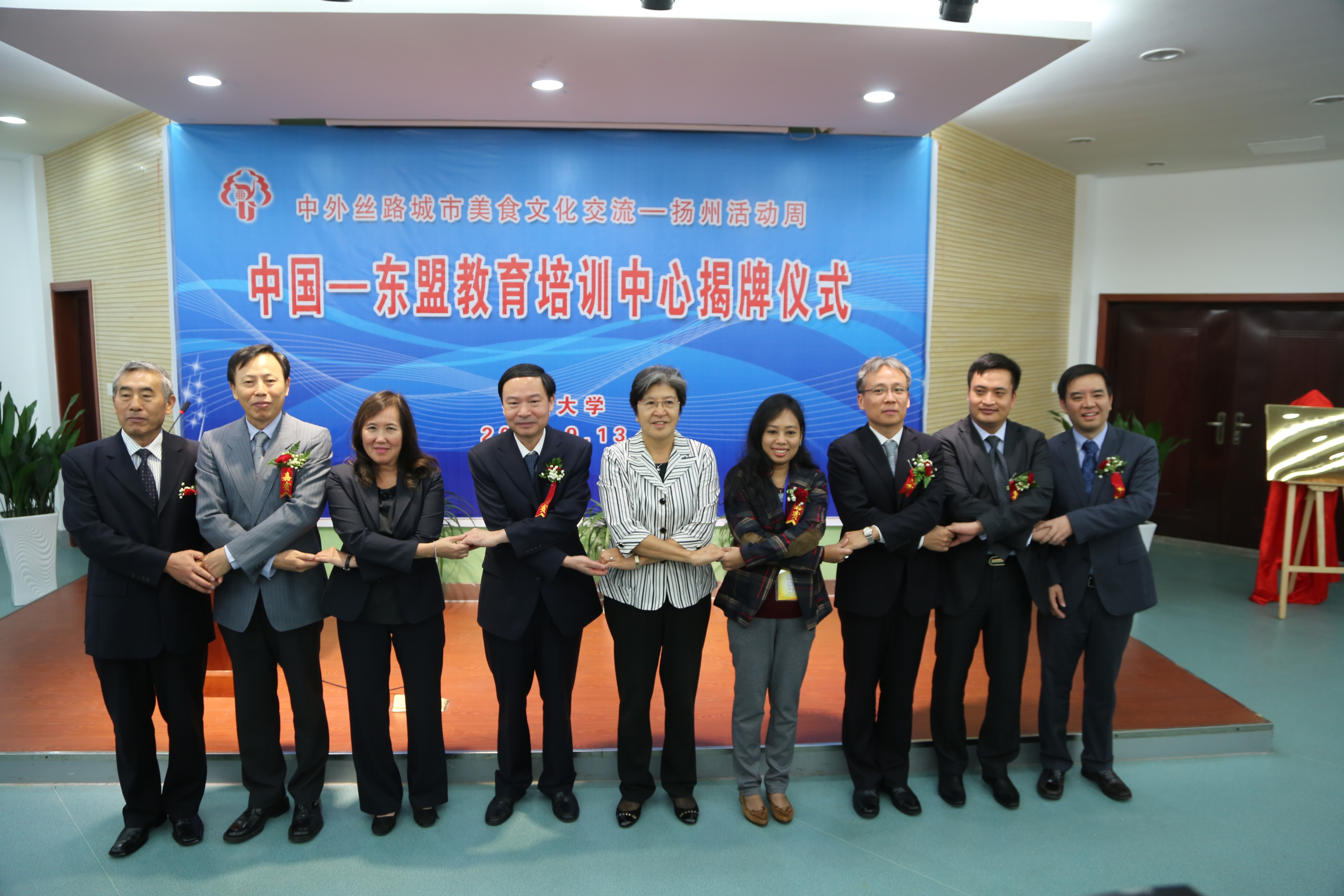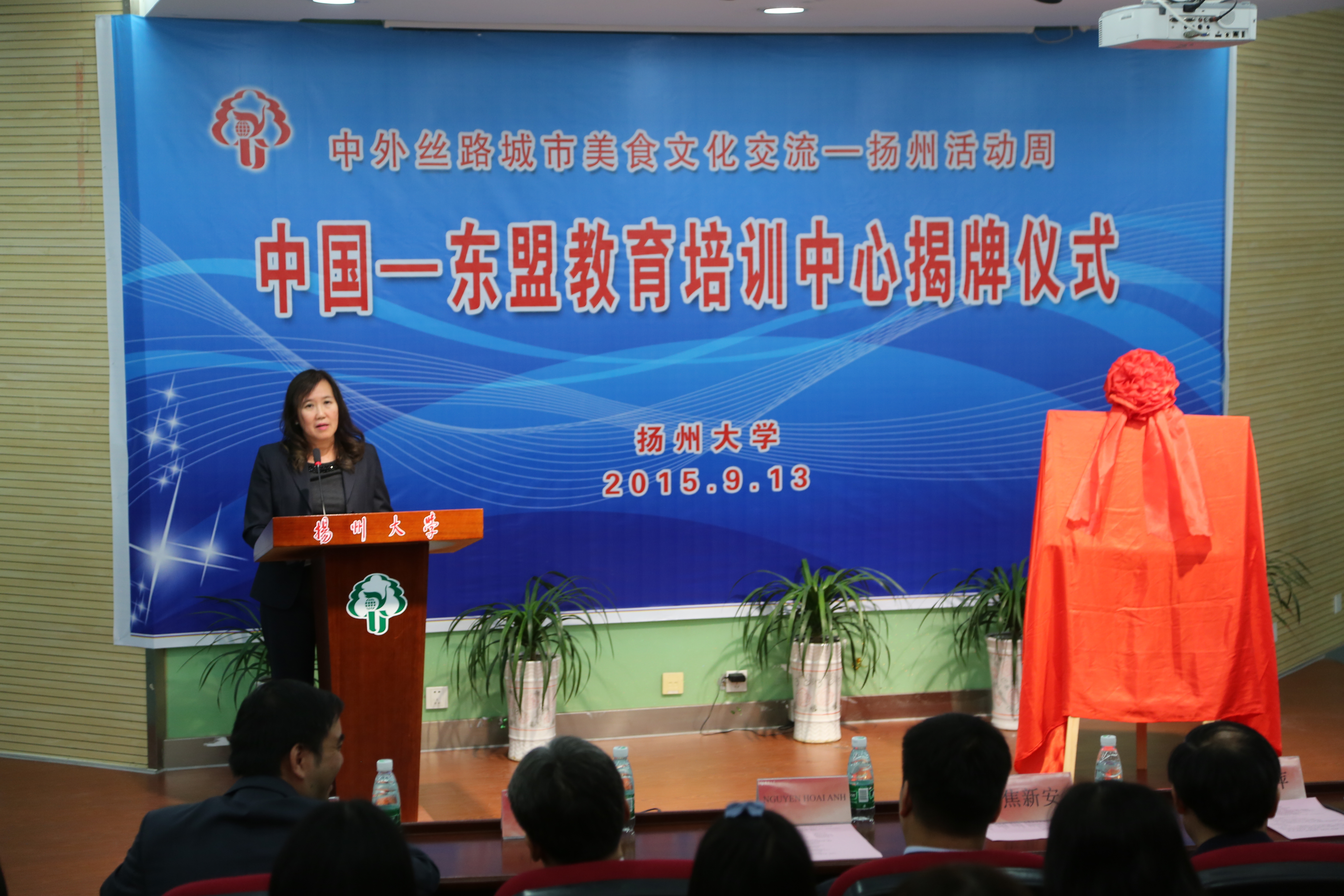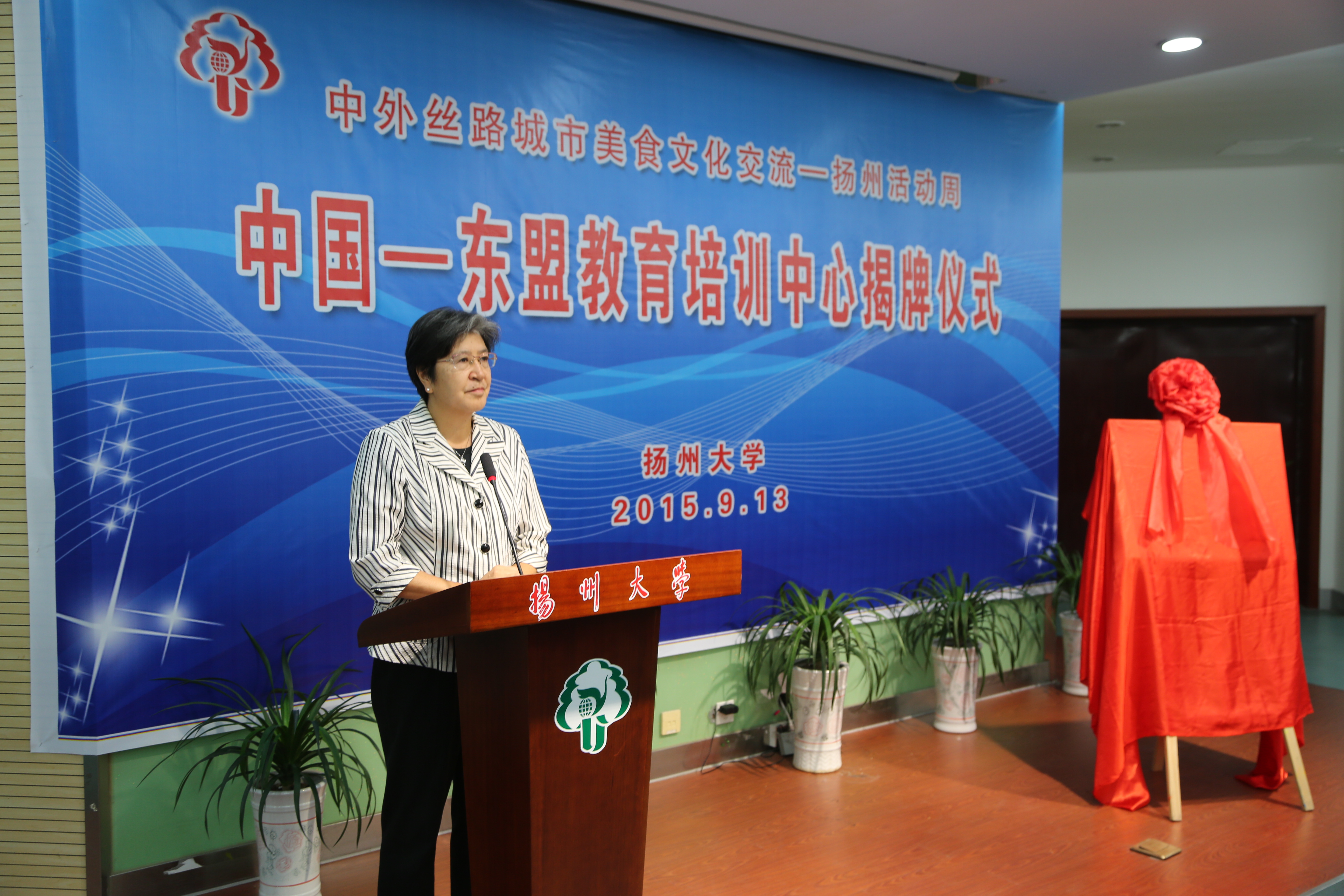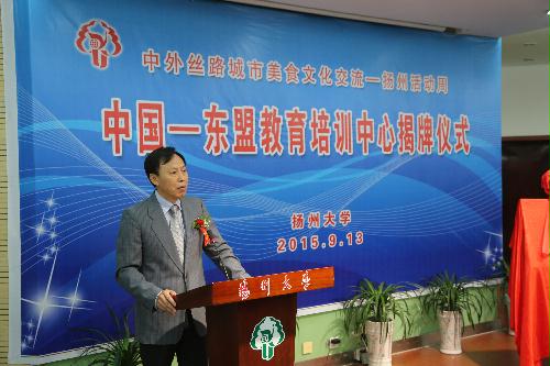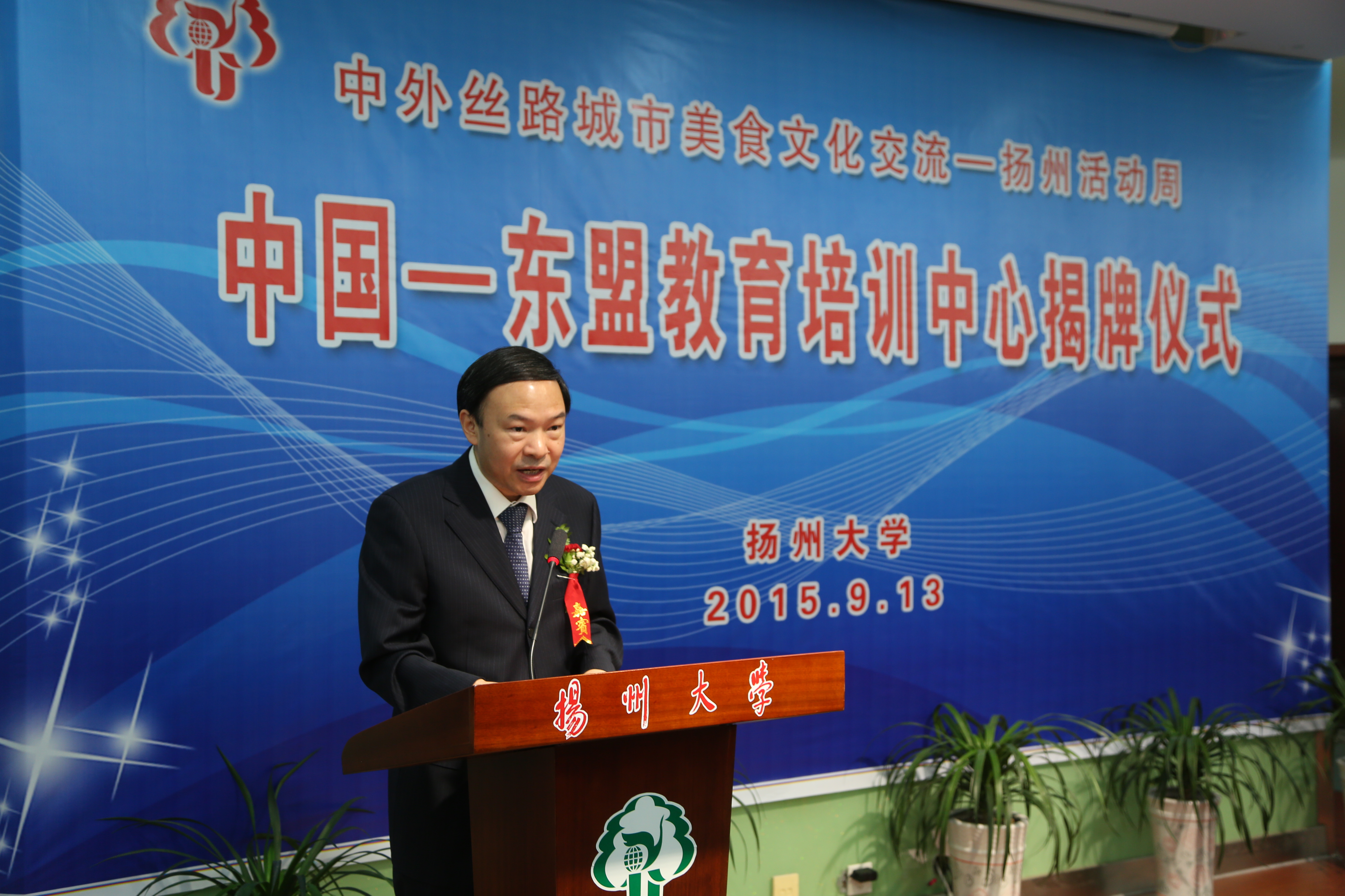 校长焦新安在揭牌仪式上致辞。焦新安说,学校已与多个东盟国家的高校、科研院所、企业、社会服务机构,在农业和畜牧业、师范教育、医疗保健、餐饮管理等多个领域开展了富有成效的教育科研合作,是“中国-东盟教育培训联盟”发起高校,并强调高层次烹饪工艺和餐饮管理人才培养,是我校办学的特色和优势,代表性地体现在“六地合一”:学校位于中国四大菜系之一——淮扬菜的发源地;是全国第一个烹饪本科专业诞生地;是世界第一台中国菜肴烹饪机器人——“爱可”的合作研发地;是国内首个、也是截止目前唯一一个“中国烹饪大师培训基地”;是国侨办惠侨工程之一、中餐繁荣计划的主要实施基地;是奥运会、世博会、亚运会等大型综合餐饮服务“国家队”的人才培养基地。他希望学校将以中心的成立为新的契机,在各国使节、各级领导、各界朋友的亲切关怀和大力帮扶下,集中优质,发挥特长,不断创新,切实把中心建设好、运行好、发展好,促使扬州市、扬州大学与东盟的传统友谊和交流合作,依托新的平台,绽放出新的生机和活力。