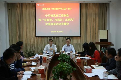 为总结前期工作成效,部署当前重点工作,10月12日下午,旅游烹饪(食品科学与工程)学院在笃行楼三楼会议室召开十月份党务工作例会。会议由党委书记孙云寿主持,党委副书记王军、各教工支部书记、学生支部书记与会。