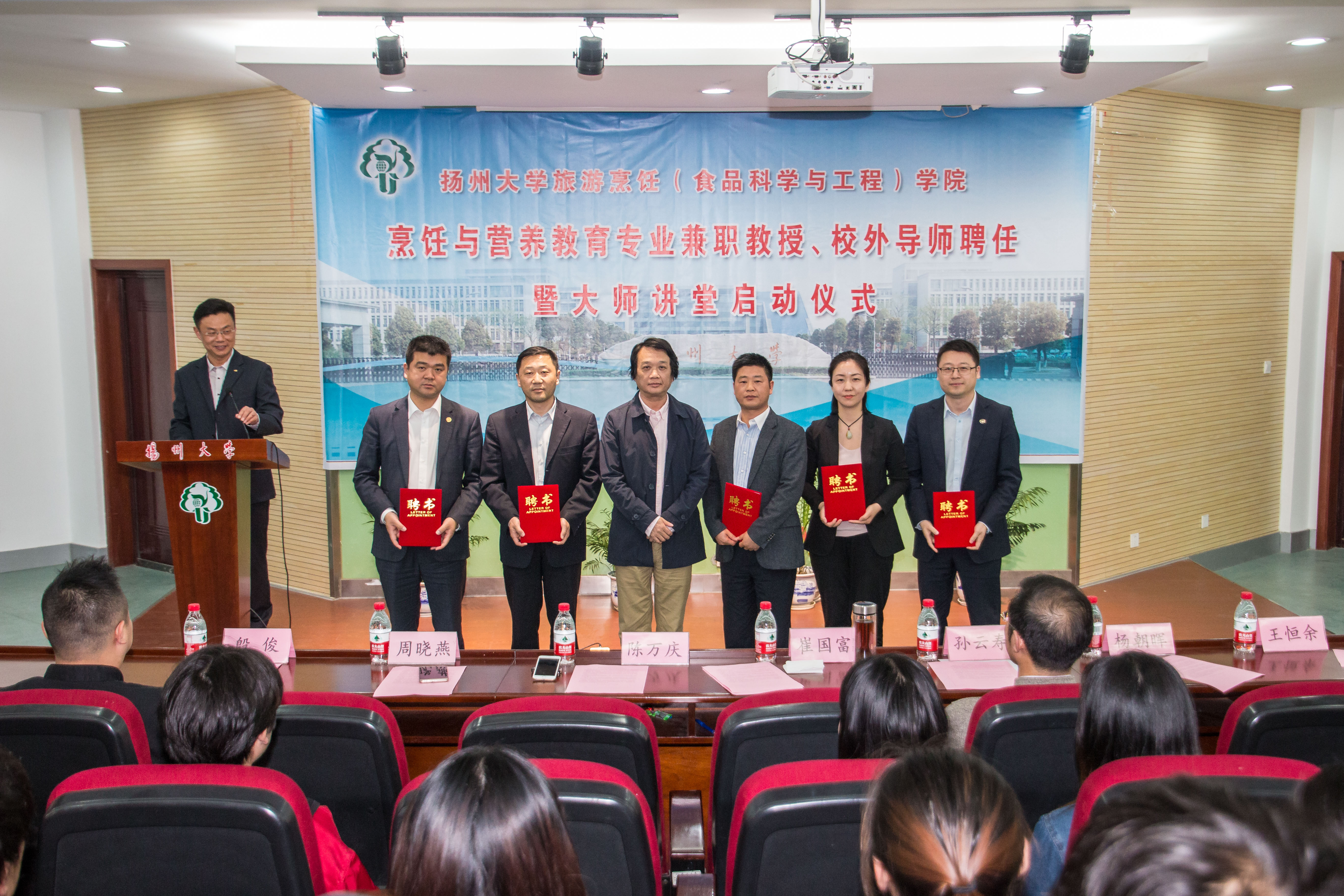 4月26日,学院在笃行楼N302召开烹饪与营养教育专业兼职教授、校外导师聘任暨大师讲堂启动仪式。院党委书记孙云寿,副院长周晓燕(主持工作),副院长韩春鲜,烹饪与营养系全体教师,全体辅导员,烹饪与营养系学生代表共100余人参加活动,活动由院党委副书记王军主持。