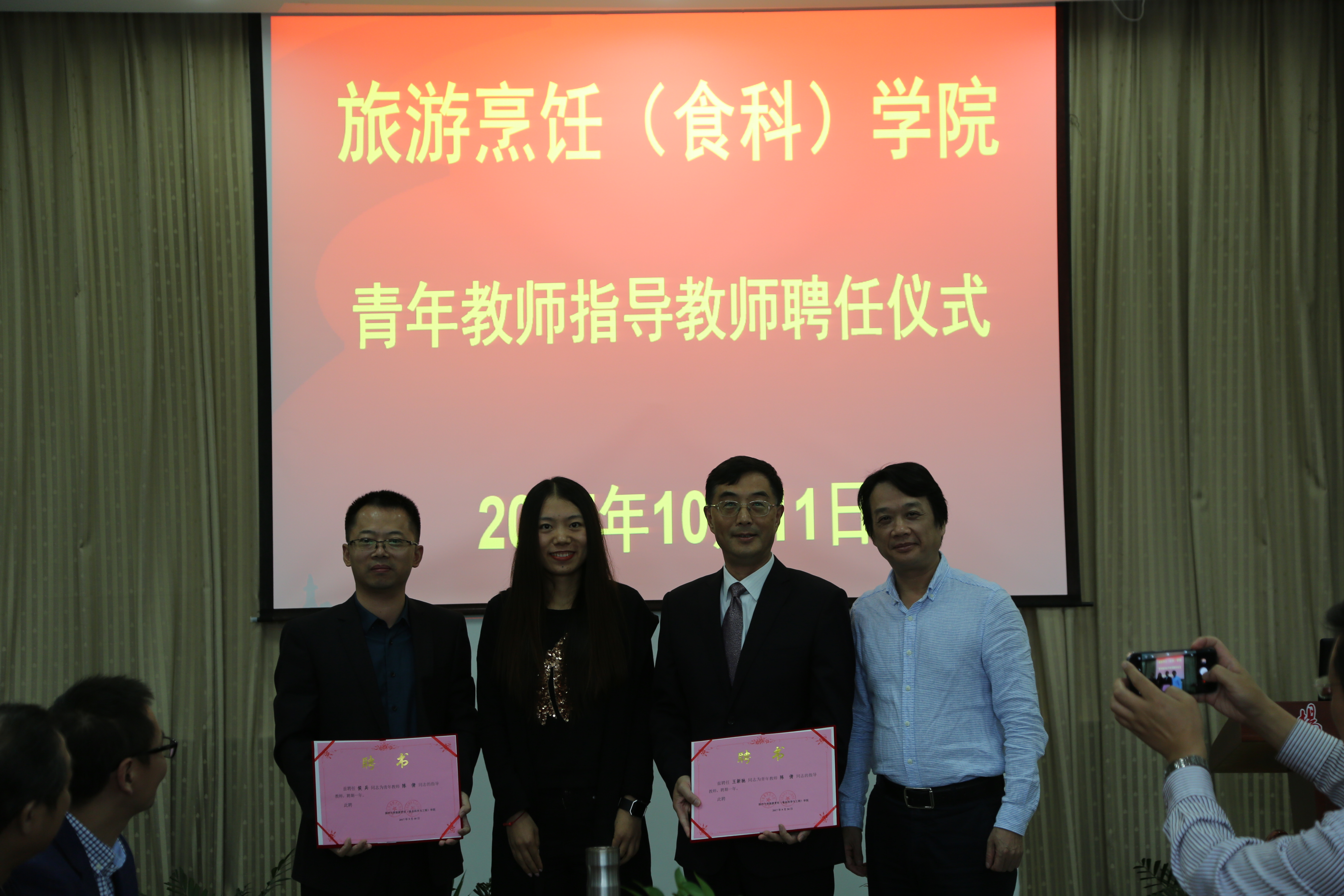 仪式由教师(教学)发展中心主持,年新引进青年教师和指导教师参加聘任仪式。