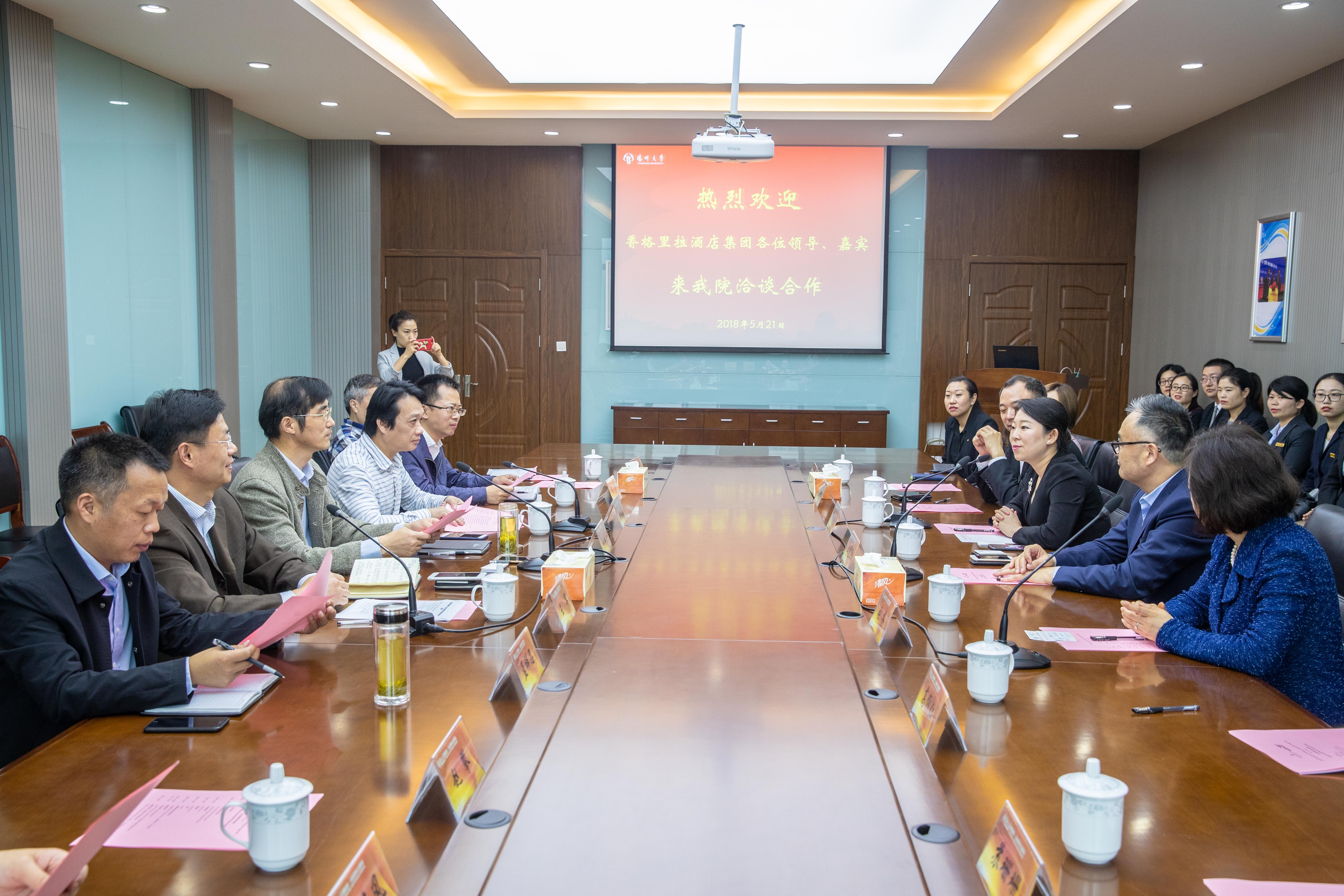 5月21日,香格里拉酒店管理(上海)有限公司集团来我院进行校企合作洽谈。香格里拉集团运营副总裁文志平、香格里拉集团中国区人力资源副总裁张齐、院党委书记孙云寿、院长周晓燕、中餐繁荣基地常务副主任侯兵出席合作洽谈会,会议由院党委副书记王军主持。