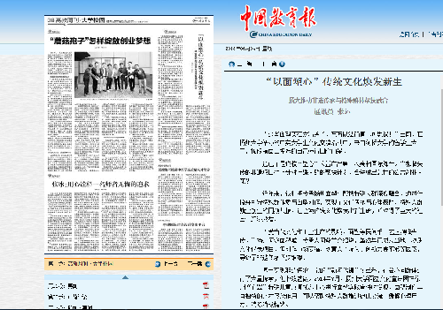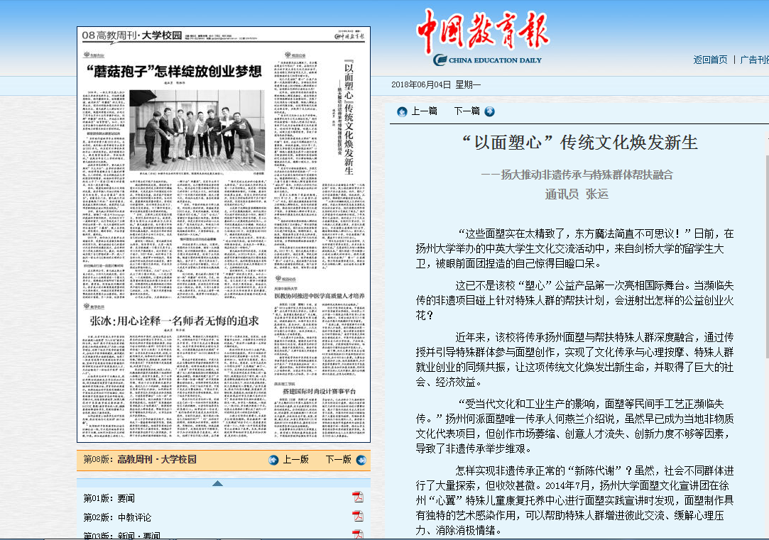 6月4日,《中国青年报》报道我院塑心公益项目,指出该项目将传承扬州面塑与帮扶特殊人群深度融合,通过传授并引导特殊群体参与面塑创作,实现了文化传承与心理按摩、特殊人群就业创业的同频共振,让这项传统文化焕发出新生命,并取得了巨大的社会、经济效益。全文约1360字。详情请点击http://paper.jyb.cn/zgjyb/html/201806/04/content_500446.htm?div=-1查阅。