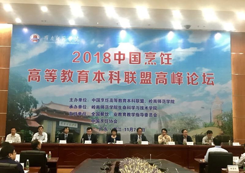 11月7–9日,2018中国烹饪高等教育本科联盟高峰论坛在岭南师范学院召开,近30所本科院校负责人和骨干教师欢聚一堂,探讨交流烹饪高等教育事业发展。活动由中国烹饪高等教育本科联盟和岭南师范学院共同主办,会议探讨了中国烹饪高等教育的科学发展之路,并发表中国烹饪高等教育本科联盟湛江宣言,论坛上我院周晓燕院长做了《烹饪本科人才教学质量 国家标准建设问题》主题演讲,院党委书记孙云寿、旅游管理系王新驰教授、烹饪与营养系主任孟祥忍参加了论坛的相关活动。