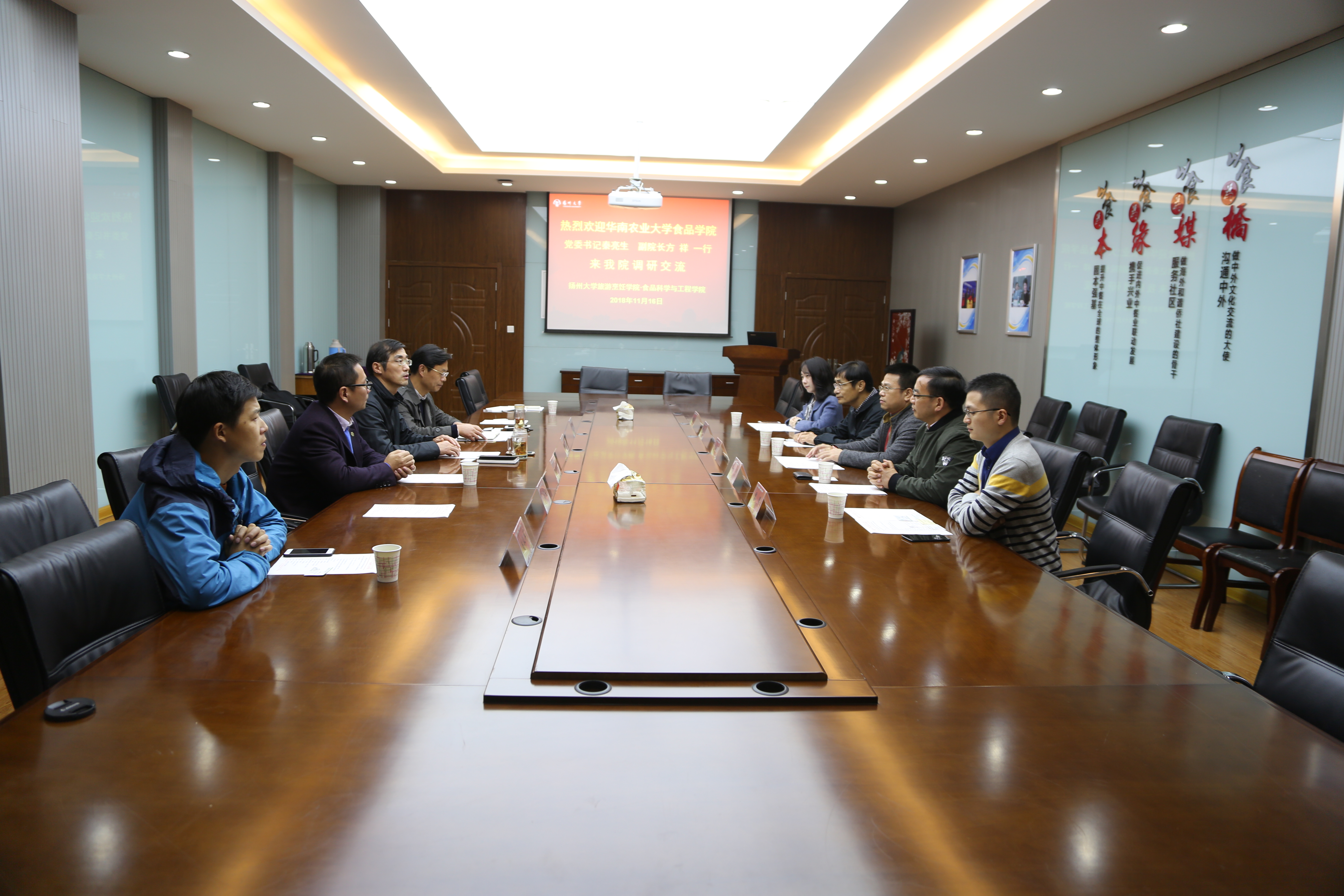 11月16日,华南农业大学食品学院党委书记秦亮生、教学副院长方祥一行五人来我院调研交流,学院党委书记孙云寿,党委副书记王军,副院长杨振泉,食品科学与工程专业、外事办公室、团委(学工办)负责人和教师代表参加本次交流会。