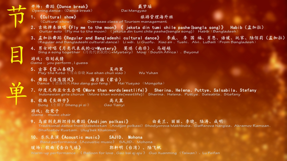 来自孟加拉、乌兹别克斯坦、印度尼西亚、蒙古等国家的学生为我们带来了极具各国特色的舞蹈和歌曲,中国学生也表演了极具中国特色的节目。