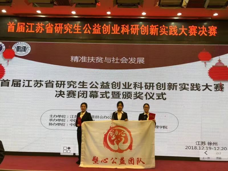 2018年12月19日至20日,江苏省首届研究生公益创业科研创新实践大赛于在中国矿业大学南湖校区举行。我院“塑心公益”研究生团队荣获一等奖。