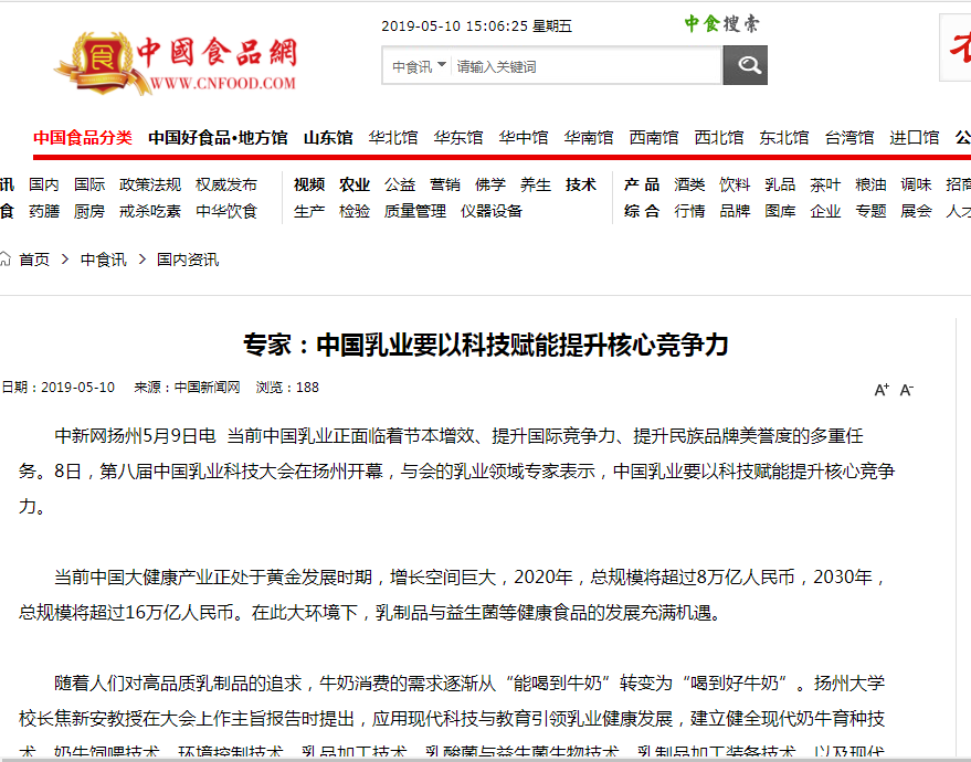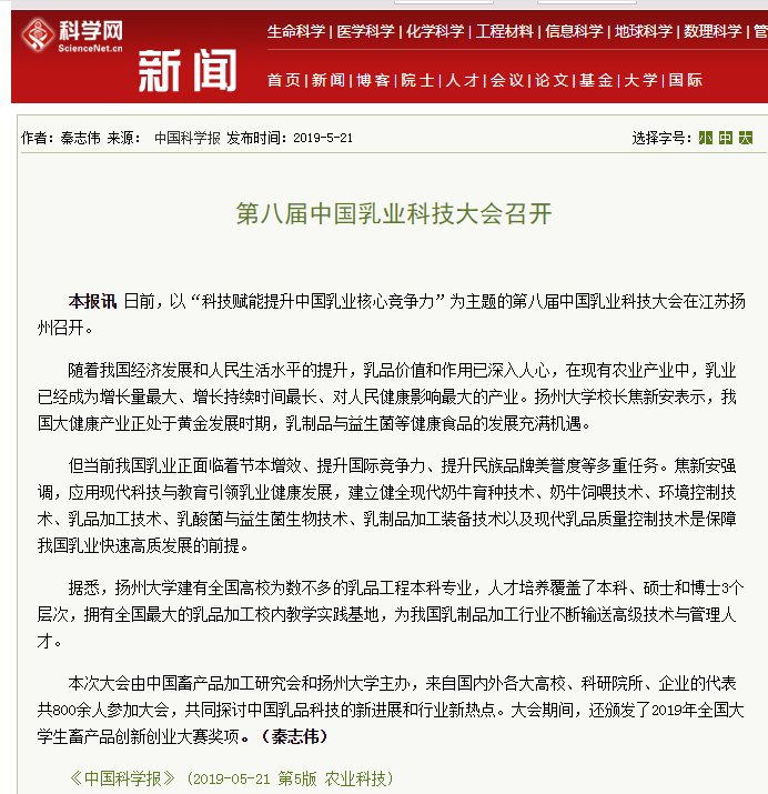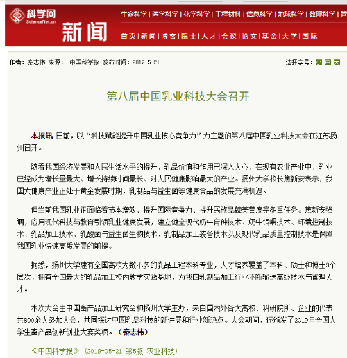 5月8日至11日,由我院承办的第八届中国乳业科技大会在扬州会议中心举行。