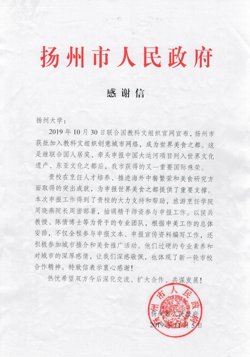 扬州市人民政府对我院在申报美食之都工作中的贡献表示感谢