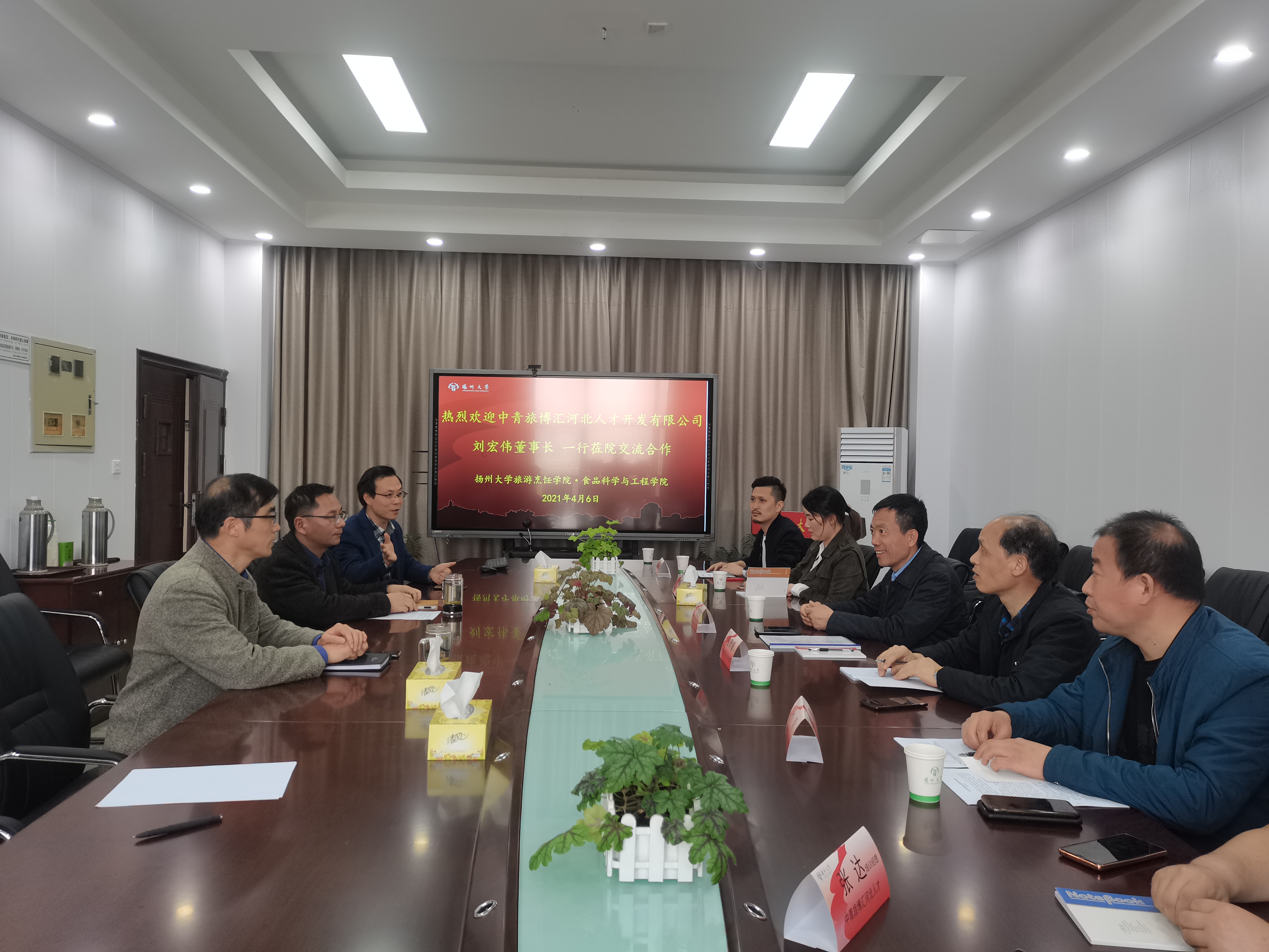 2021年4月6日,中青旅博汇河北人才开发有限公司董事长、中青旅博汇(北京)会展运营管理有限公司总经理刘宏伟先生一行莅临我院,学院党委孙云寿书记、杨副院长振泉与来宾就双方加强校企合作进行沟通与交流,深入地探讨了学生实习与就业、人才培养方案、师资队伍建设、行业标准制定、康养食品研发等的进一步合作,双方一致同意建立常态化的工作机制,加强日常沟通与交流,逐步落实各项合作事宜,共同提高双方产学研合作质量和水平。