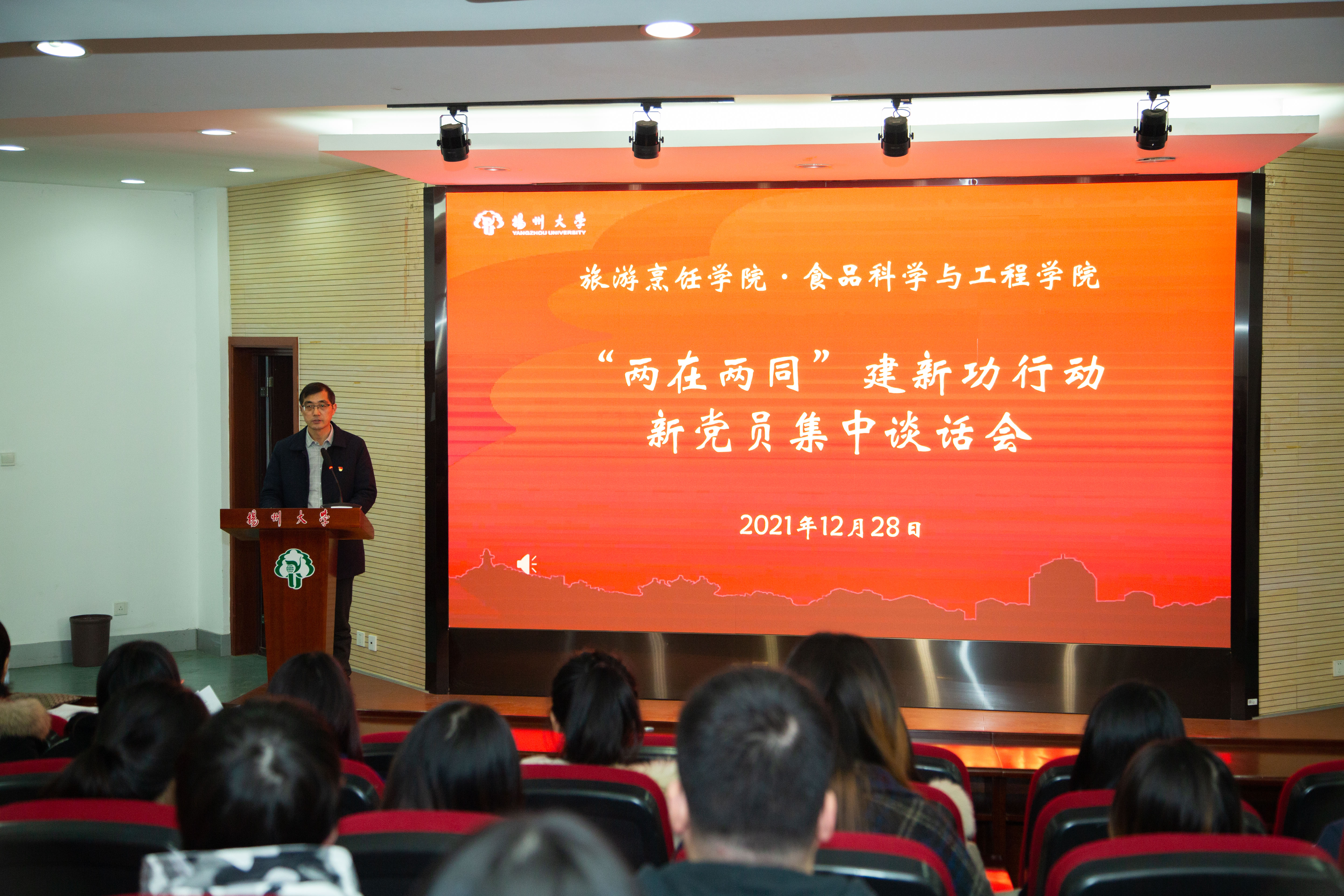 面向党旗,全体新党员庄严宣誓,坚定为共产主义事业奋斗终生的决心。全体党支部书记为新党员代表佩戴党徽,发放纪念品。食品科学与工程系党支部教师王洋、食品2002班杨诗雨作为新党员代表发言,回顾自己的成长历程,并向党组织庄严承诺,在今后的工作学习和生活中不忘初心,时刻牢记共产党员身份,以实际行动为党旗添彩,为党徽增光。