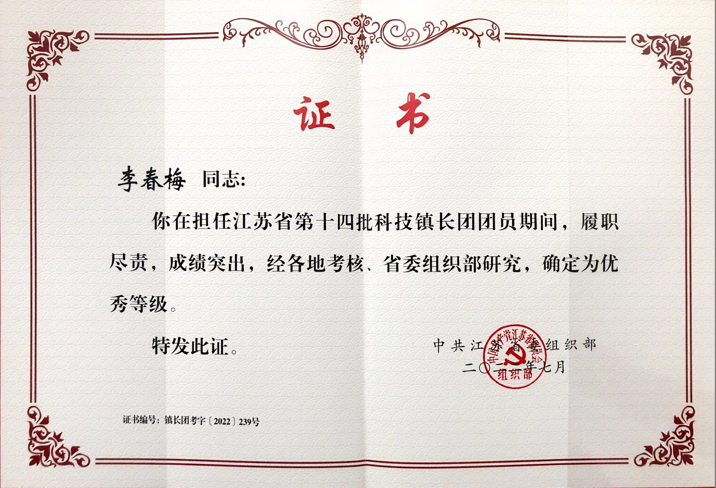 近日,经江苏省组织部统一考核,我院选派的江苏省第十四批科技镇长团成员李春梅老师获工作考核优秀等次。