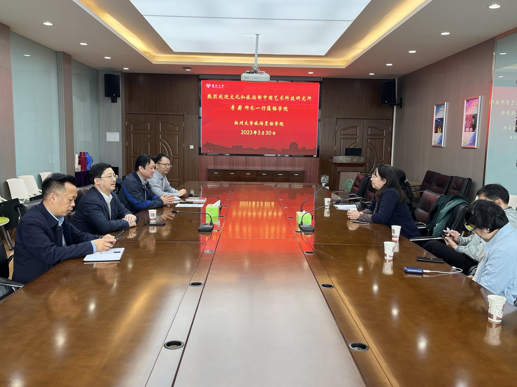 2023 年3 月30 日,中国艺术科技研究所所长李蔚、全国艺术科学规划项目管理部主任邱邑洪、标准研究部主任张素贤、全国艺术科学规划项目管理部主管姚宇航一行来我院进行工作调研。扬州大学人文社科处处长王金铨、副处长李长庆、项目管理科科长禹良琴、旅游烹饪学院院长侯兵、中餐繁荣基地主任、副院长孟祥忍、中餐非遗技艺传承文旅部重点实验室主任周晓燕陪同调研。