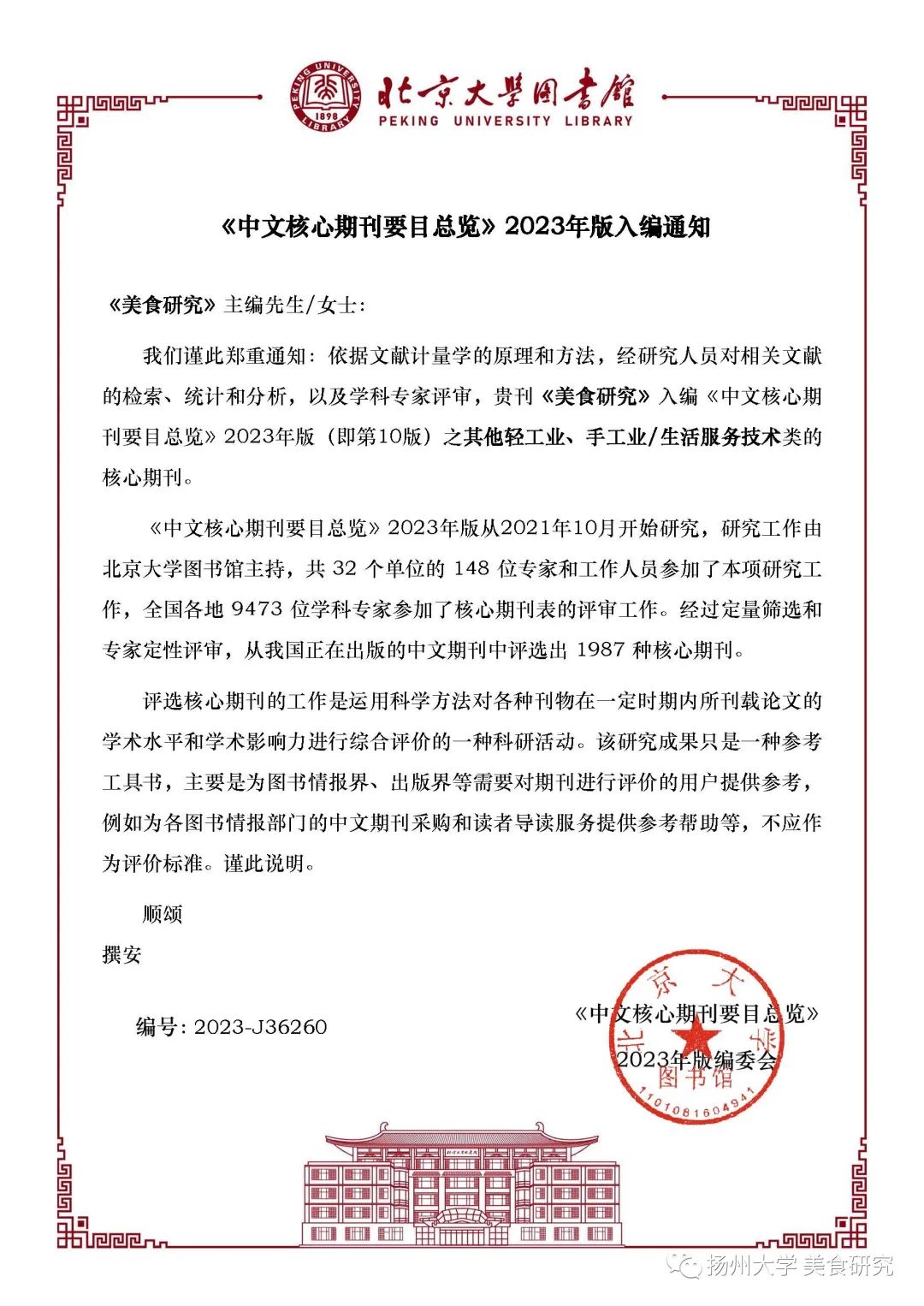 近日,接北京大学图书馆《中文核心期刊要目总览》2023 年版编委会通知,扬州大学《美食研究》再次入编《中文核心期刊要目总览》2023年版(即第10版)之“其他轻工业、手工业/生活服务技术”类的核心期刊。