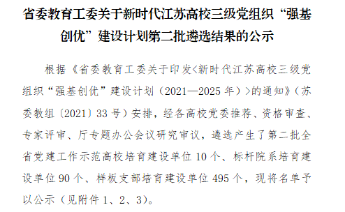 日前,中共江苏省委教育工作委员会印发《关于新时代江苏高校三级党组织“强基创优”建设计划第二批遴选结果的公示》,我院烹饪与营养系教工党支部成功入选第二批全省党建工作样板支部培育建设单位。
