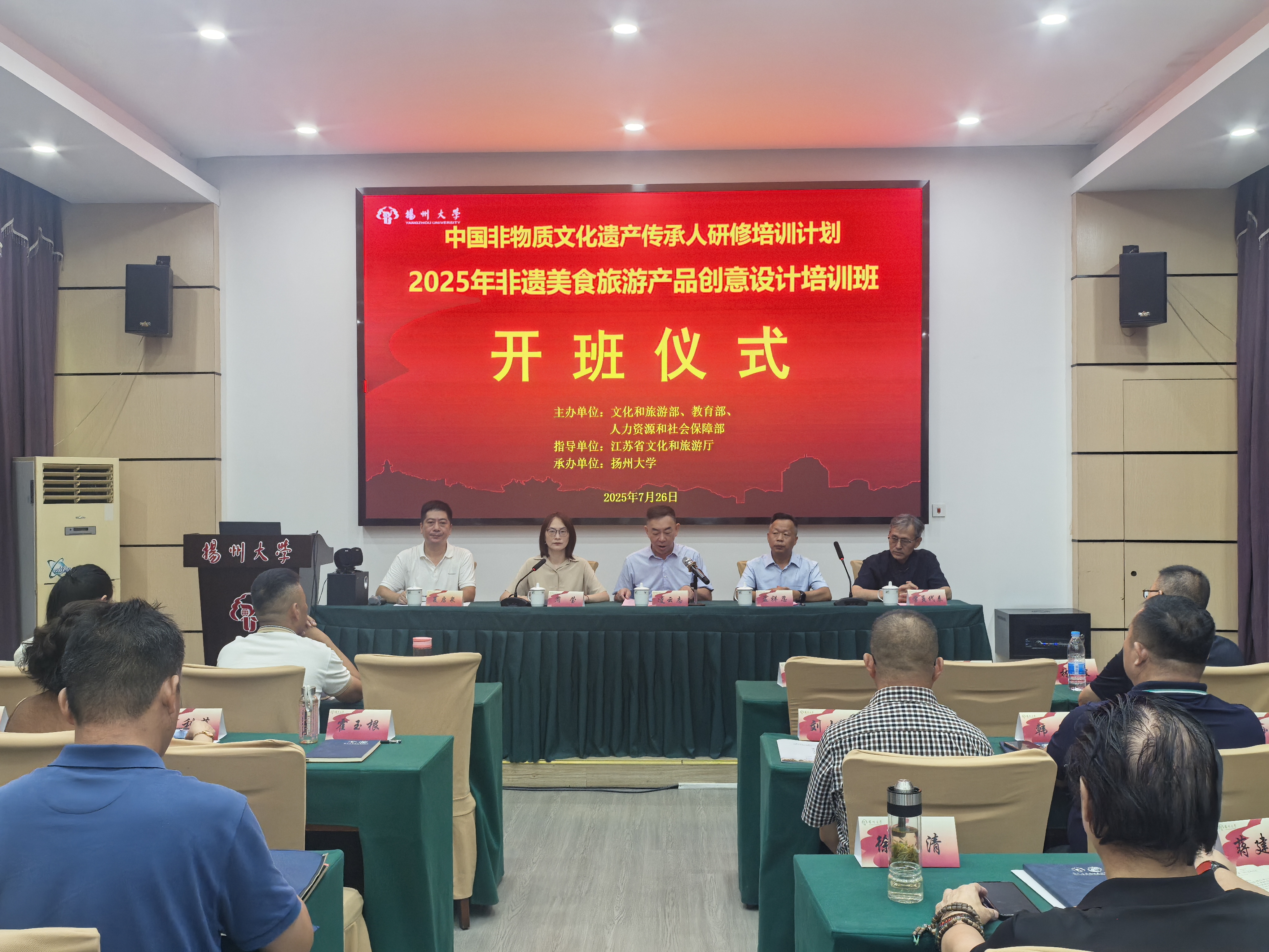 7月26日上午,由文化和旅游部、教育部、人力资源和社会保障部主办,扬州大学承办的中国非物质文化遗产传承人群研修研习培训计划—非遗美食旅游产品创意设计研修班在扬州大学旅游烹饪学院正式开班。