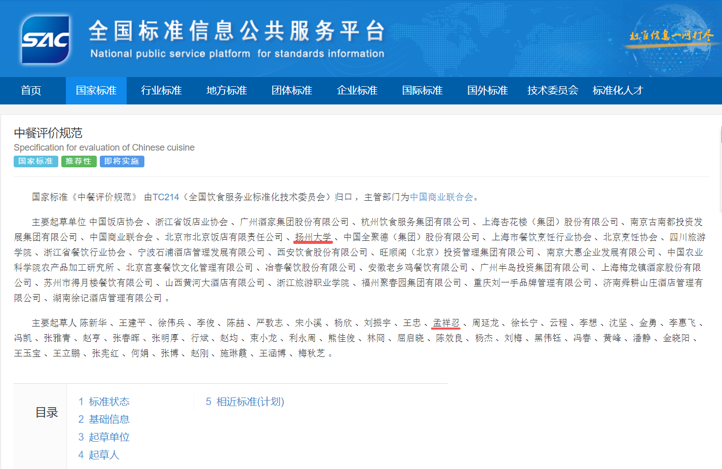 近日,国家市场监督管理总局(国家标准化管理委员会)正式发布了《中餐评价规范》(GB/T 46275-2025)。该标准是我国餐饮行业重要的基础性标准,由我院作为主要起草单位,孟祥忍教授作为主要起草人参与编制。