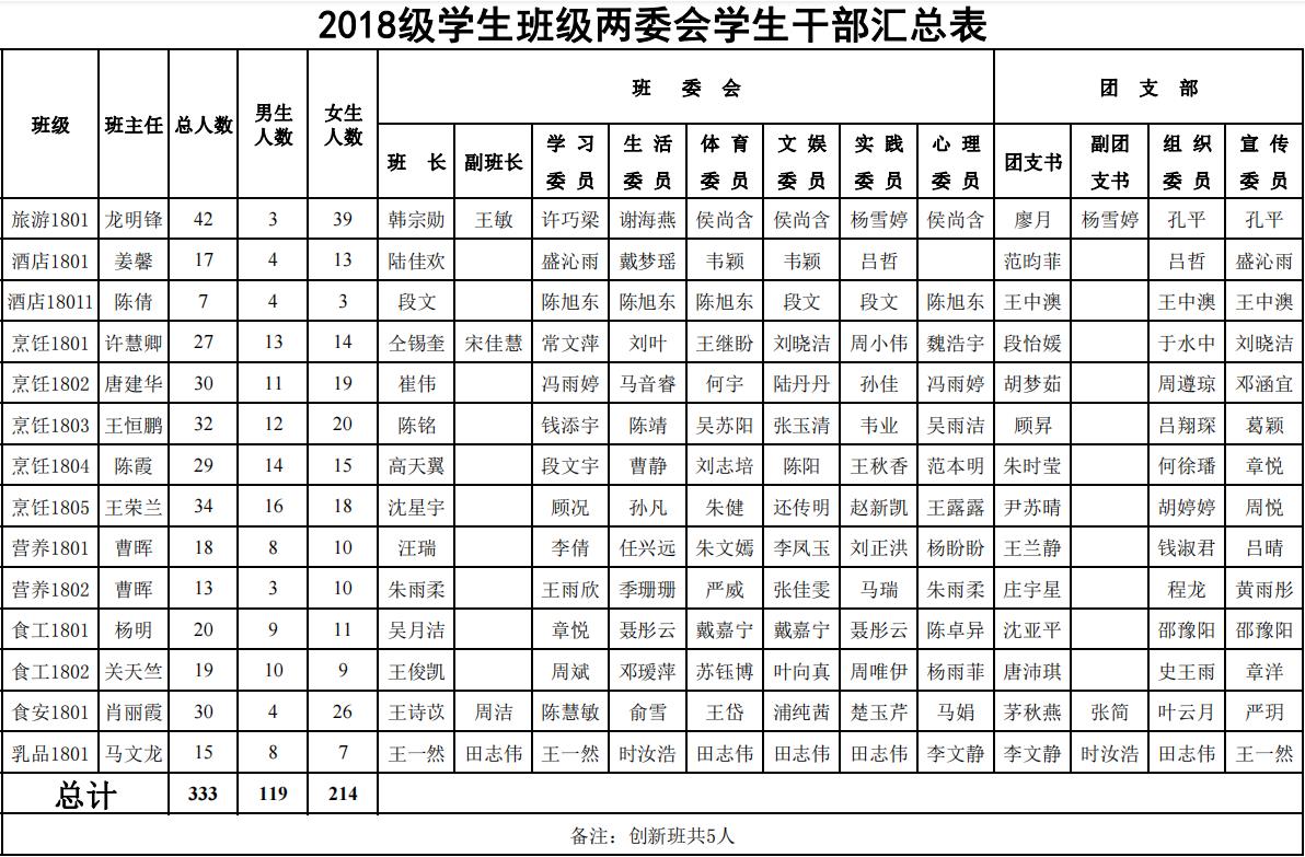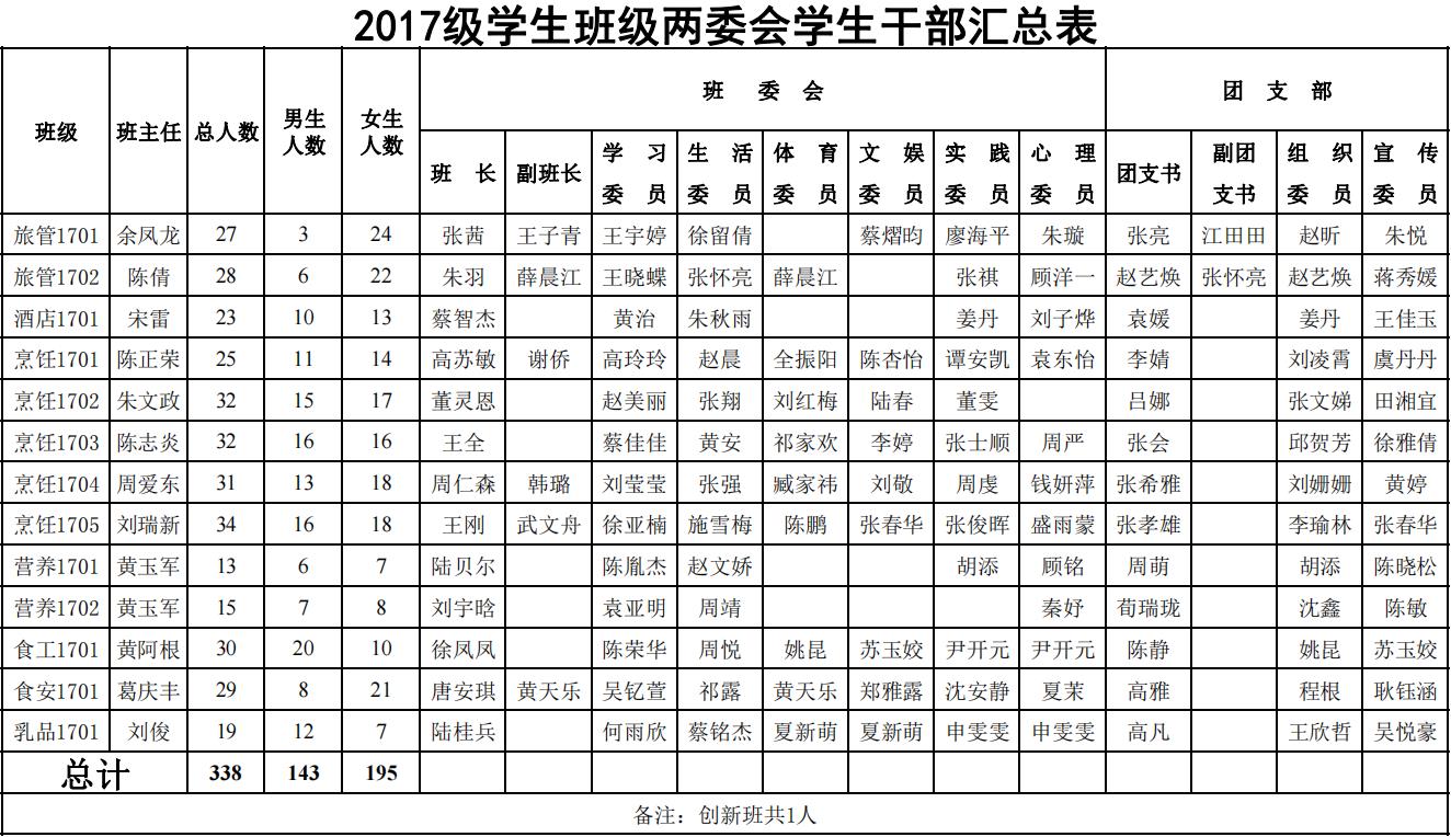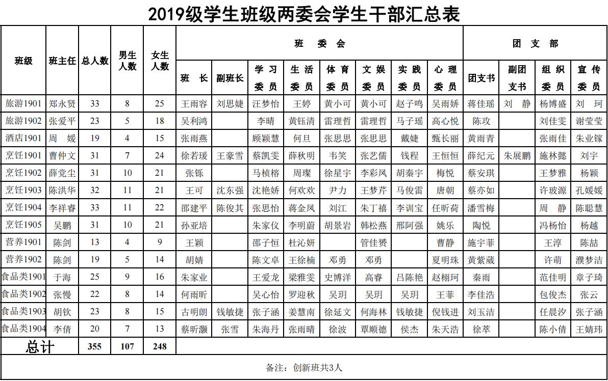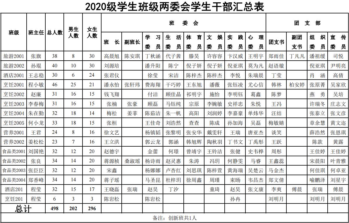 2020-2021学年班级两委会学生干部汇总表